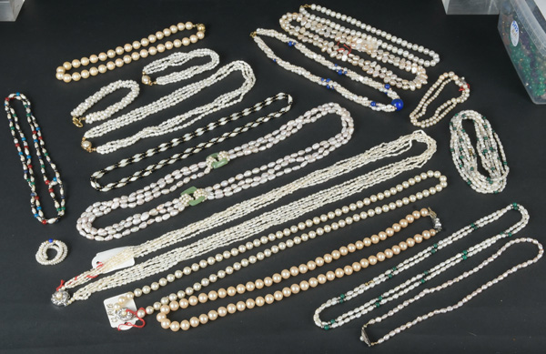 - Katalog-Nr: 618Konvolut Perlenketten, u.a. mit 8 kt Gold- bzw. Silberverschluss, teilw. besetzt mit Jade- und Lapislazulikugeln, L=42 bis 100 cm.o.L.