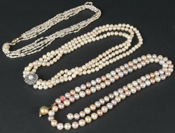 - Katalog-Nr: 619Drei Perlenketten mit 14 kt Goldverschluss, einer besetzt mit Saphiren, L=40 bis 86 cm.o.L.