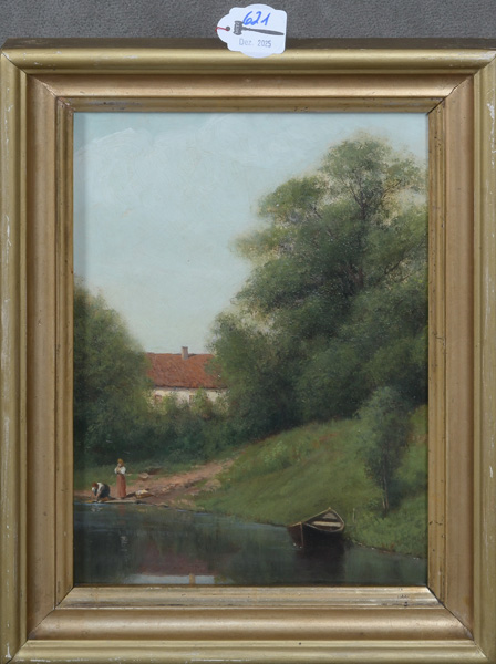 - Katalog-Nr: 621Maler des 19. Jhs. Uferlandschaft mit Wäscherinnen und Gebäude im Hintergrund. Öl/Karton, gerahmt, 32,5 x 26,5 cm.o.L.