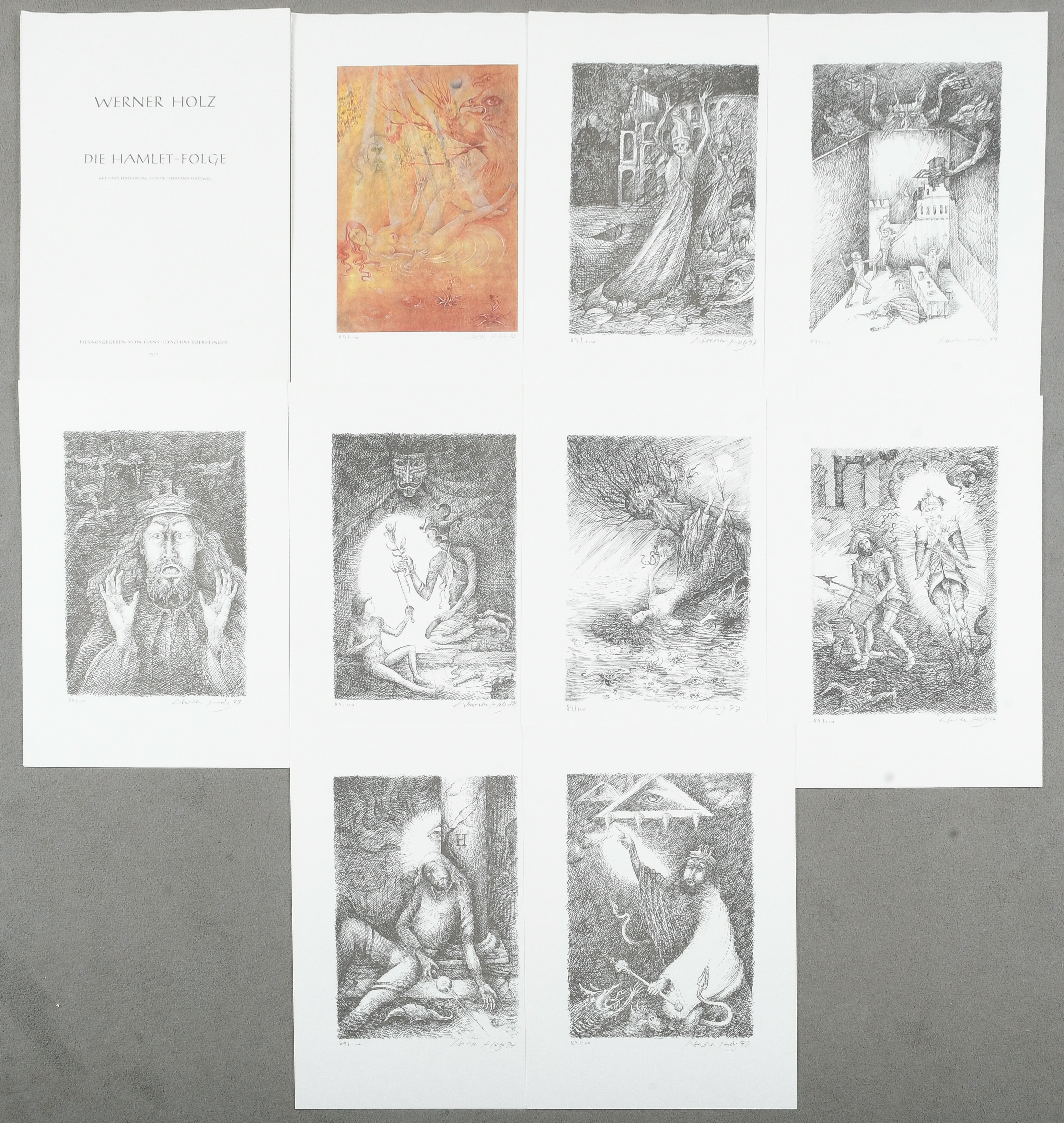 - Katalog-Nr: 631Werner Holz (1948-1991). Mappe „Die Hamlet-Folge“ mit Einführung von Dr. Hermann Hartwig und neun Lithographien, je re./u./sign./dat. 1977/num. 89/100, 28,5 x 19,5 cm.o.L.