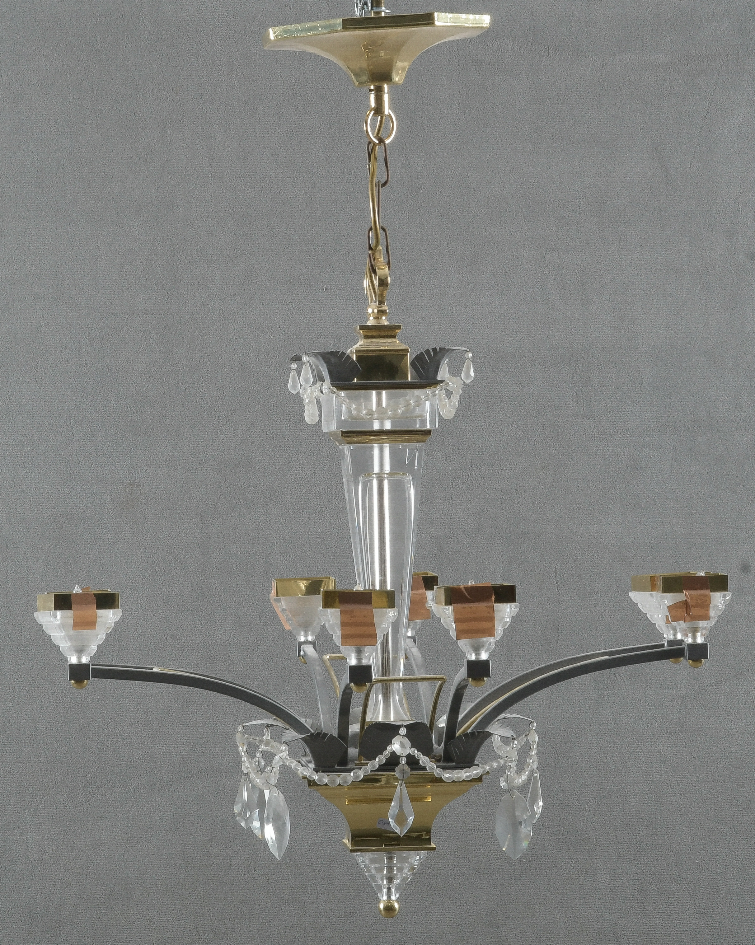 - Katalog-Nr: 632Sechsflammiger Deckenlüster im Empirestil. Italien 20. Jh. Messinggestell, mit Glasprismen, H=92 cm, D=49 cm. (Funktion ungeprüft)o.L.