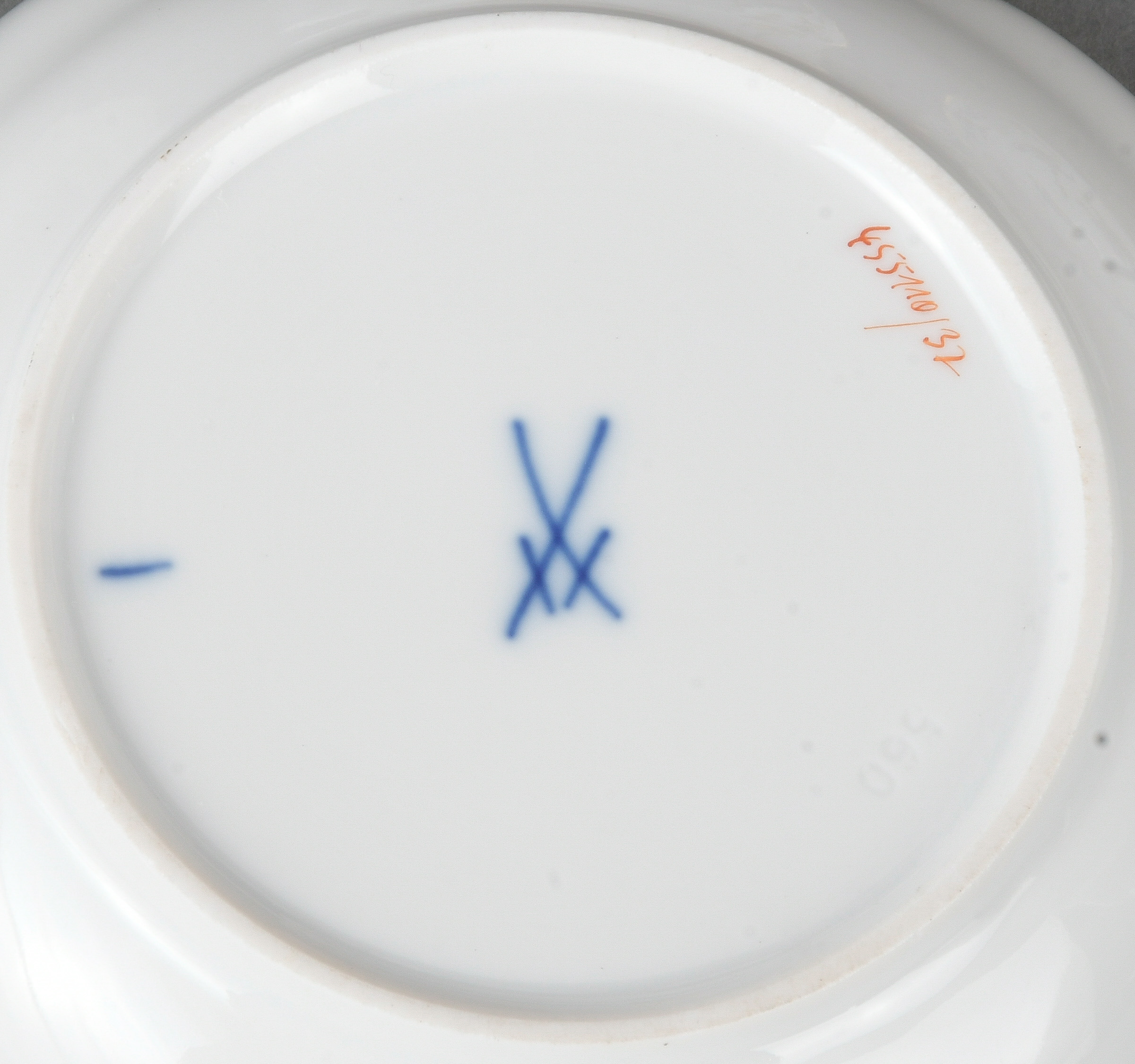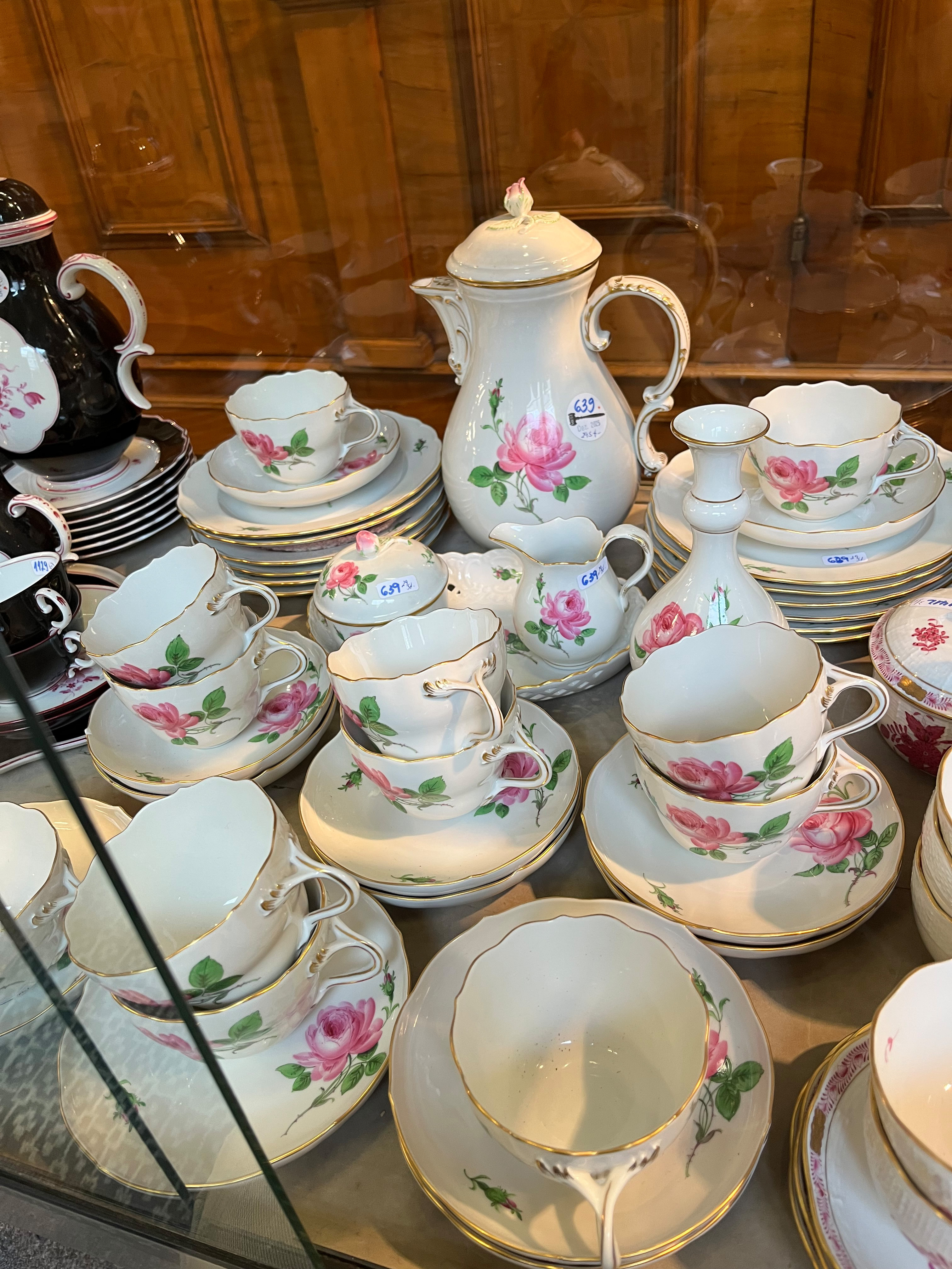 - Katalog-Nr: 63929-tlgs. Kaffeeservice „Rote Rose“. Meissen 20. Jh. Porzellan, bunt bemalt, mit Goldrand. Bestehend aus: Eine Kaffeekanne (H=28 cm), ein Milchgießer (H=9,5 cm), eine Zuckerdose (H=9 cm), zwölf Tassen mit Unterschalen, zwölf Kuchenteller (D=je 20,5 cm), eine Vase (H=17,5 cm) eine ovale Durchbruchsschale (H=4,4 cm, B=23 cm, T=15,8 cm). (min. best.)o.L.