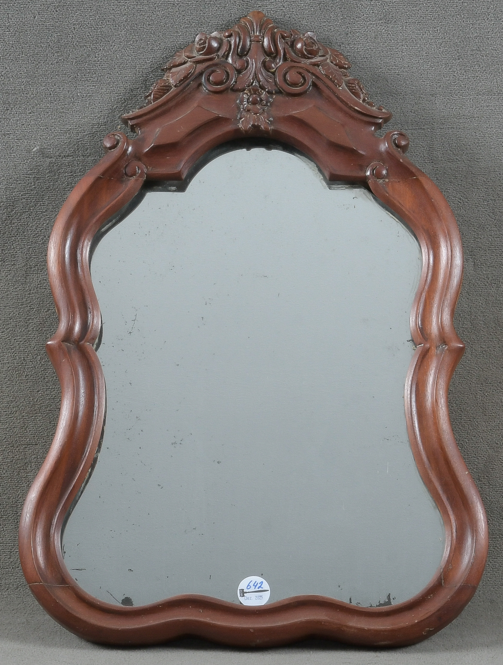 - Katalog-Nr: 642Louis-Philippe-Spiegel. Deutsch 19. Jh. Massivholz, geschnitzt mit Blüten und Rocaillen, teilw. profiliert, 67 x 45 cm.o.L.