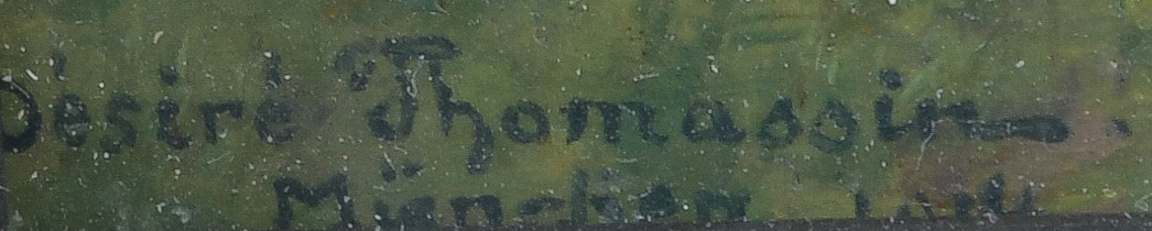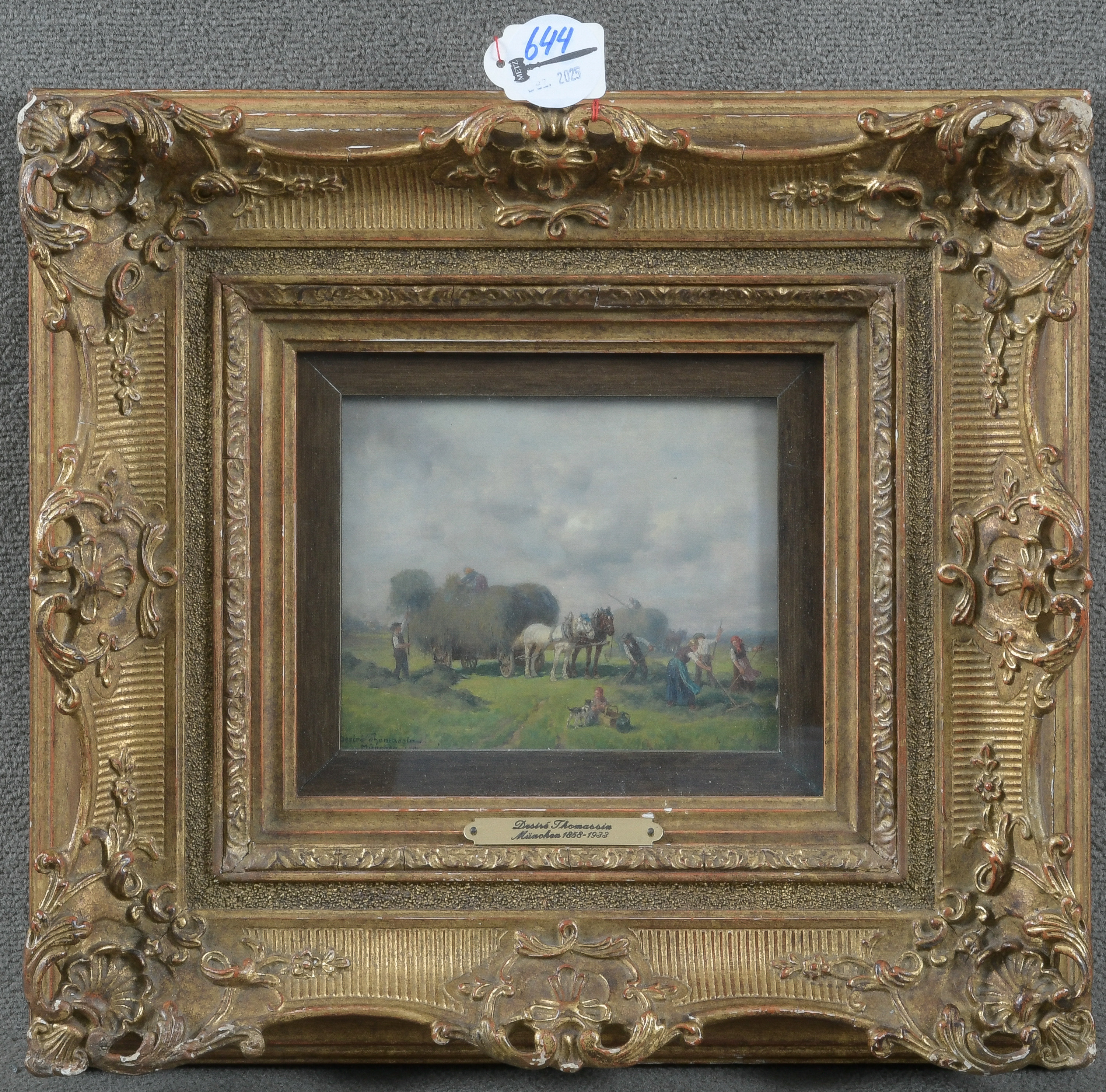 - Katalog-Nr: 644Désiré Thomassin-Renardt (1858-1933). Heuwagen und Feldarbeiter in Panoramalandschaft. Öl/Holz, li./u./sign./dat. 1914/bez. „München“, hi./Gl. gerahmt, 13 x 15 cm.o.L.