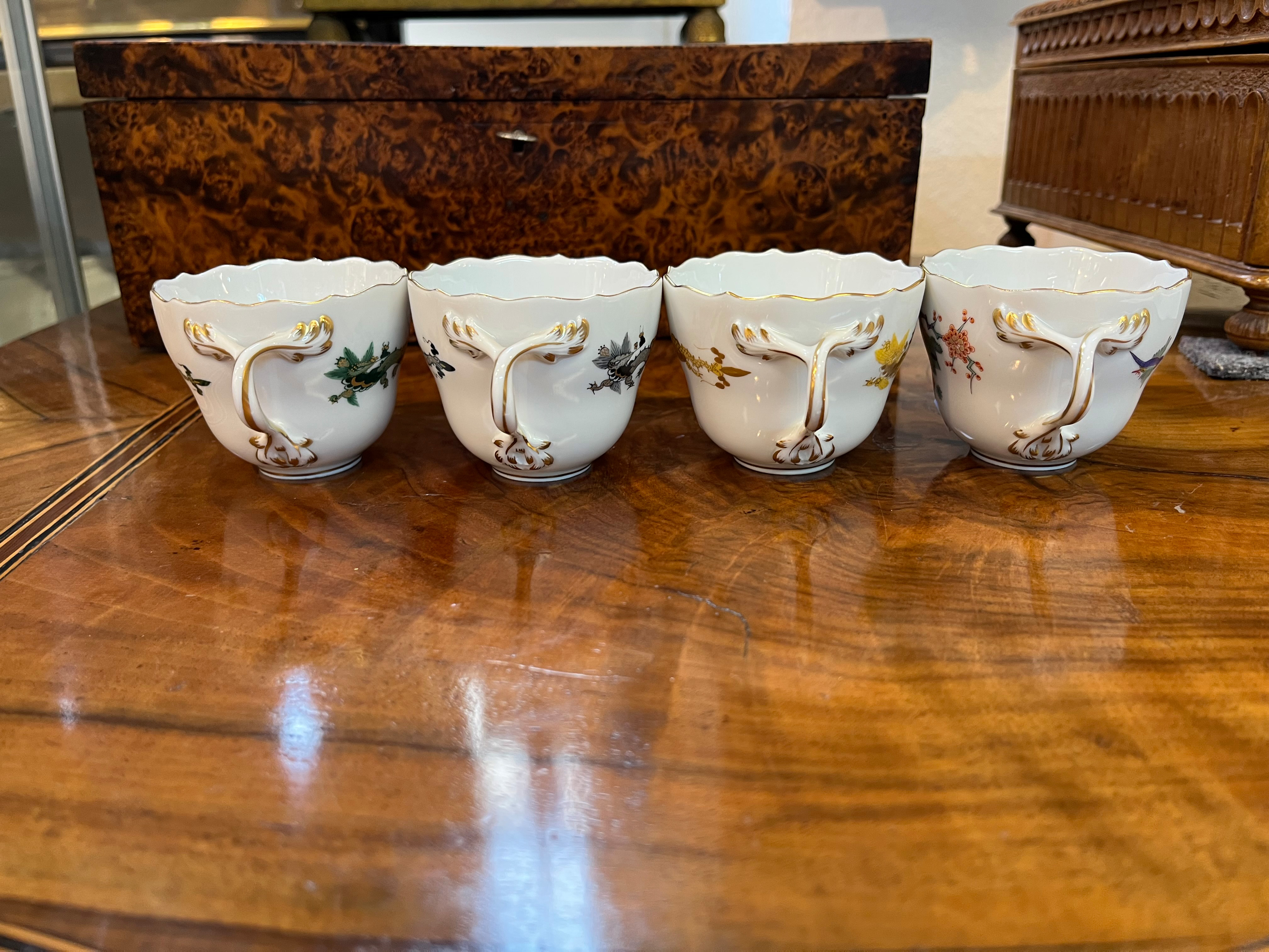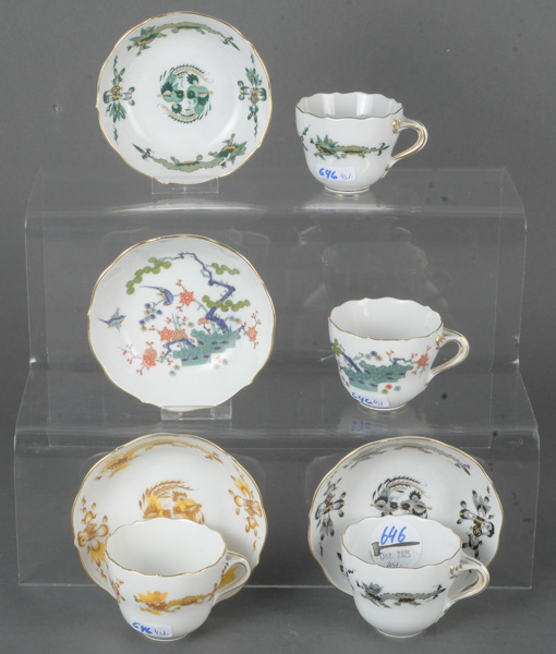 - Katalog-Nr: 646Vier Mokkatassen mit Untertassen. Meissen 20. Jh. Porzellan, unterschiedlich bunt bemalt mit Drachen- bzw. Kakiemonblütendekor; verso unterglasurblaue Schwertermarke.o.L.