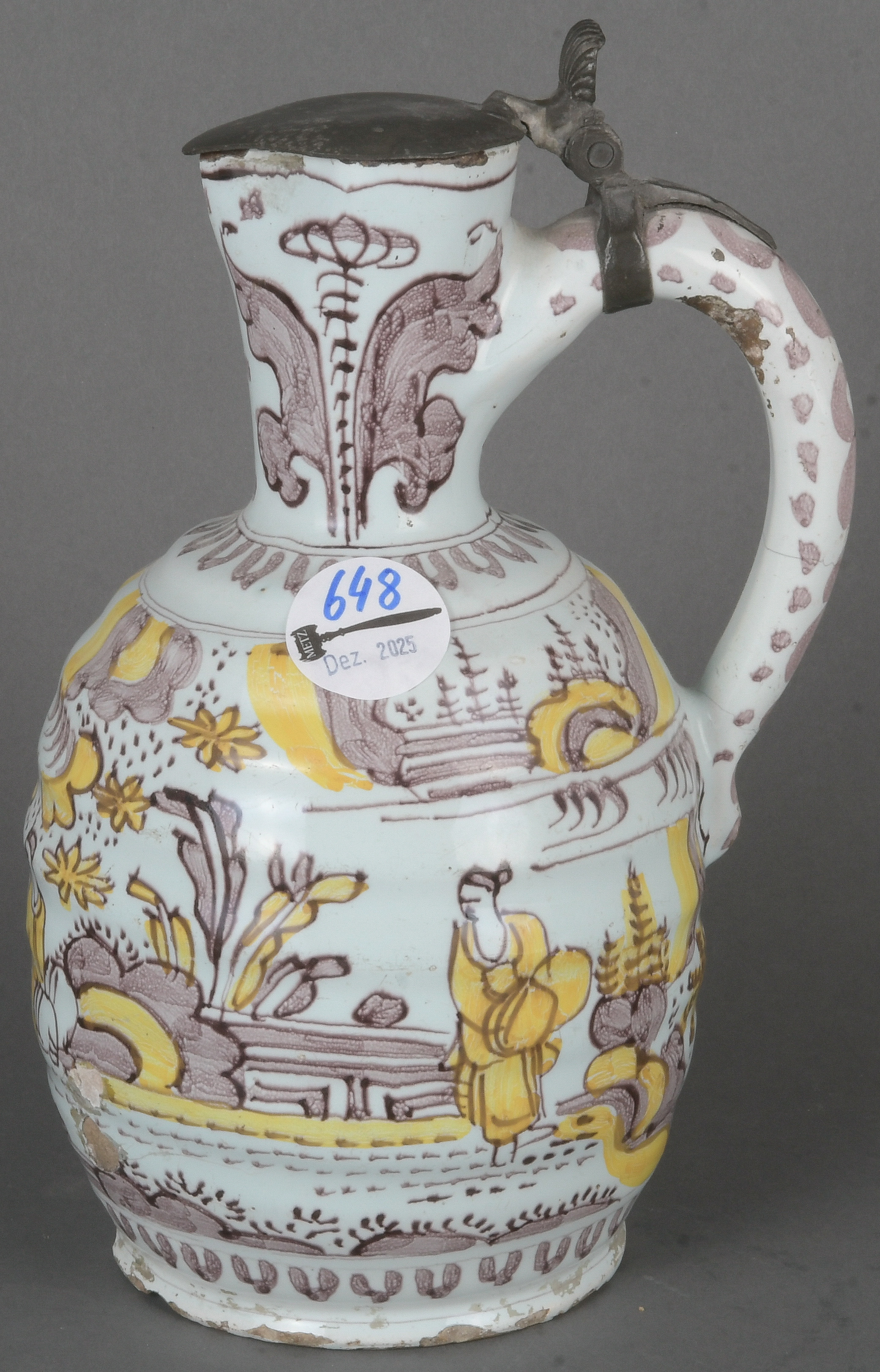 - Katalog-Nr: 648Enghalskrug. Frankfurt um 1700. Fayence, mangan und gelb bemalt mit Chinoiseriendekor, mit Zinnmontur und -deckel, H=25 cm. (best.)o.L.