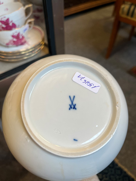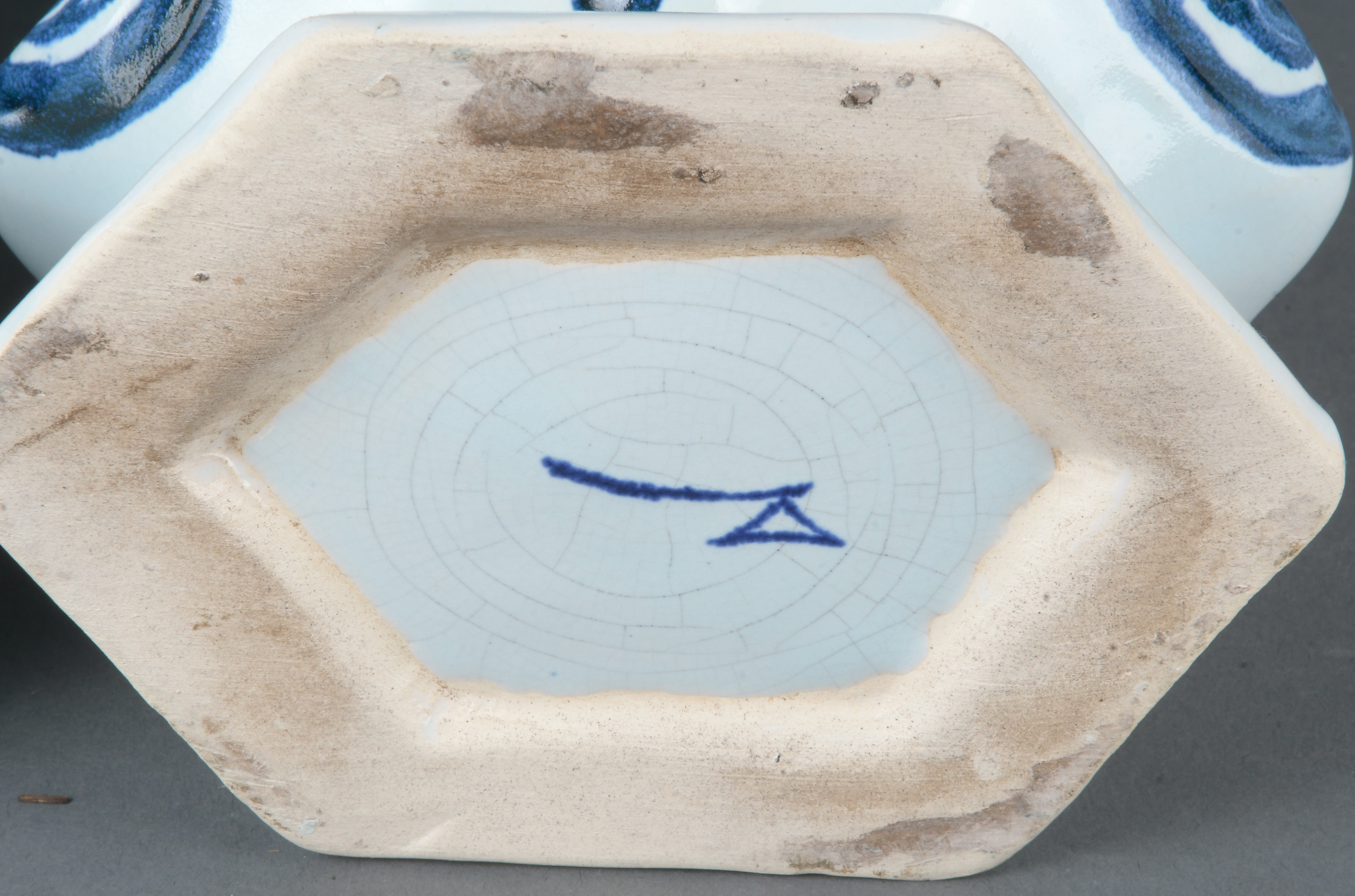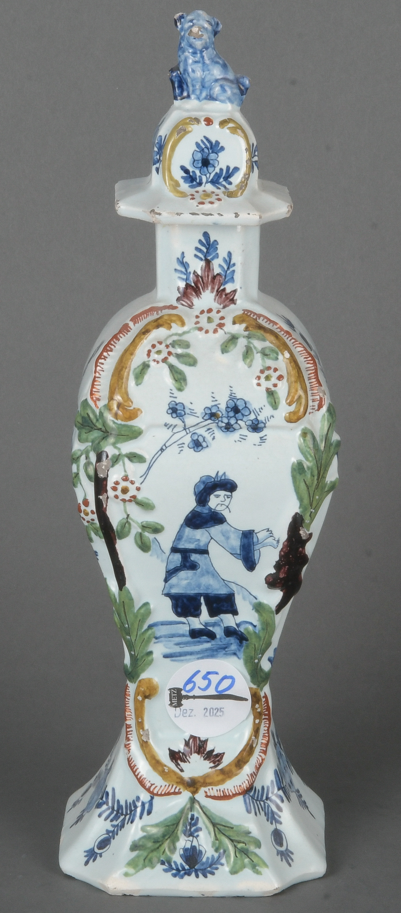 - Katalog-Nr: 650Deckelvase. Wohl Kassel 18. Jh. Fayence, unterglasurblau bemalt mit Chinoiserien; am Boden mit ligierter HL-Marke, H=32 cm. (best.)o.L.