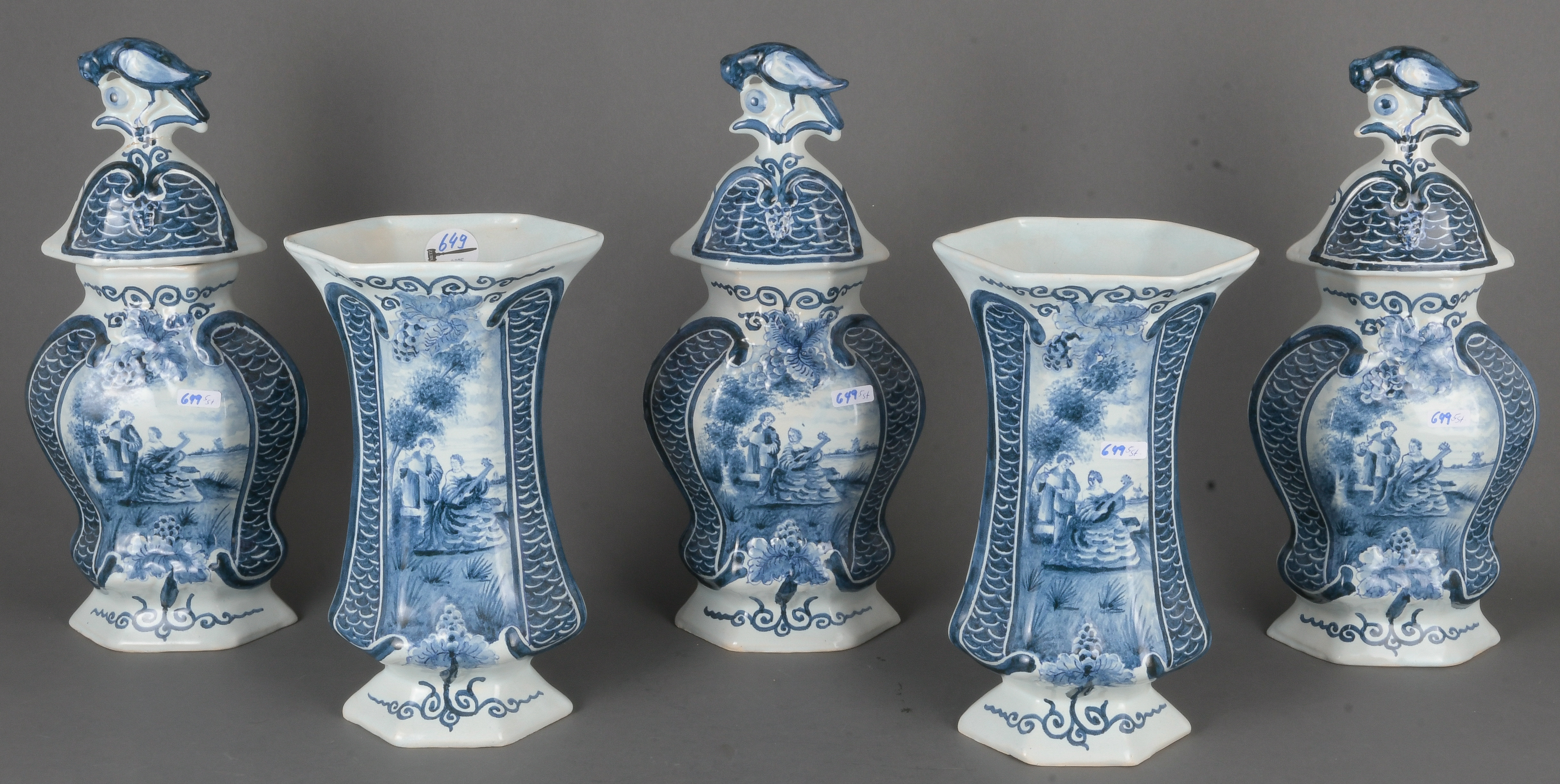 - Katalog-Nr: 649Fünftlger. Vasensatz. Delft 20. Jh. Fayence, unterglasurblau bemalt mit Watteauszenen. Bestehend aus: Drei Deckelvasen und ein Paar Seitenvasen ohne Deckel, H=28,8 / 38,5 cm.o.L.