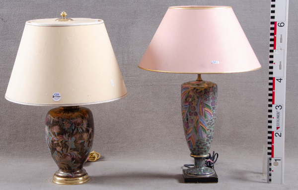 - Katalog-Nr: 630Zwei Designer-Tischlampen. Je Porzellankorpus, bunt dekoriert, mit Stoffschirm, H=63 / 65 cm. (Funktion ungeprüft)o.L.