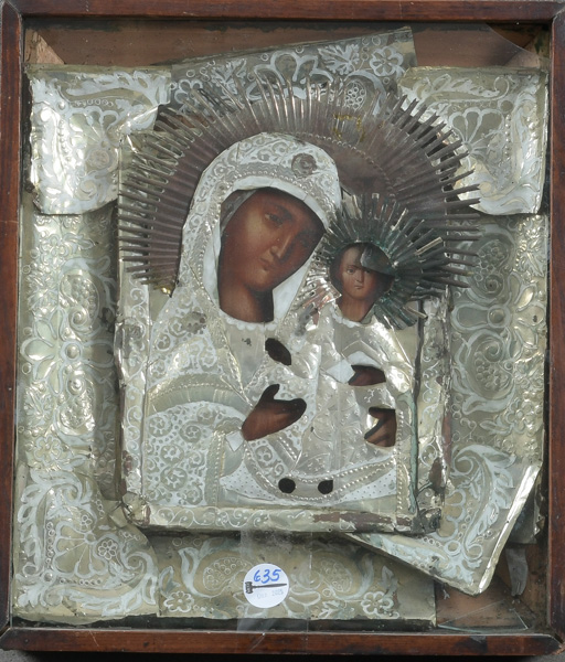 - Katalog-Nr: 635Ikone mit der Muttergottes. Russland 19. Jh. Holztafel mit Temperamalerei und versilbertem Oklad, hi./Gl. gerahmt, 42 x 36 cm. (Glas u. Oklad besch.)o.L.