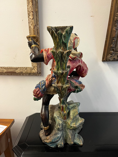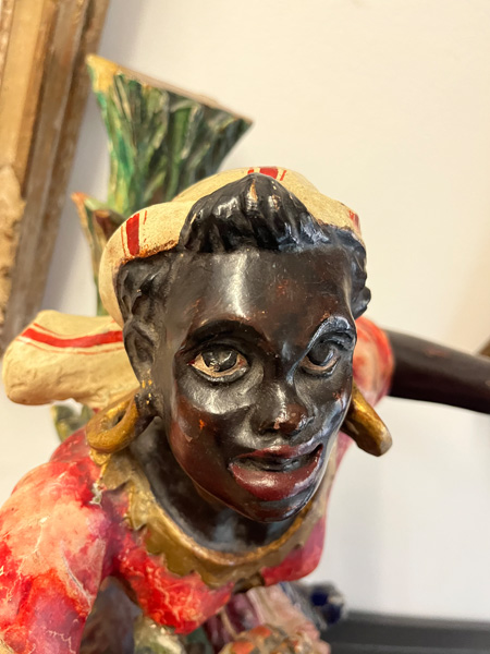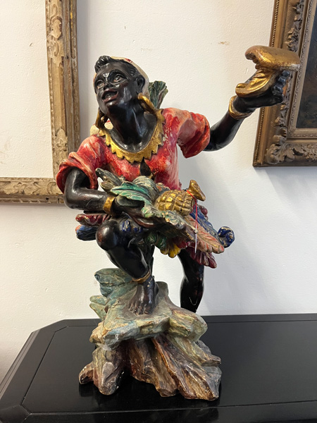 - Katalog-Nr: 637Sich auf Felssockel stützende Figur mit Ananas und Klapper. Wohl Venedig 20. Jhs. Massivholz, geschnitzt, auf Kreidegrund bunt gefasst und gold gehöht, H=56,5 cm.o.L.
