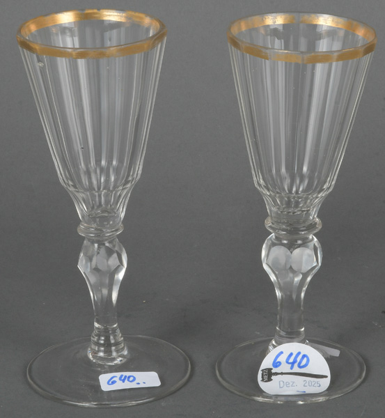- Katalog-Nr: 640Paar Likörgläser. Schlesien 18./19. Jh. Farbloses Glas, geschliffen, mit Goldrand, H=15,4 cm.o.L.