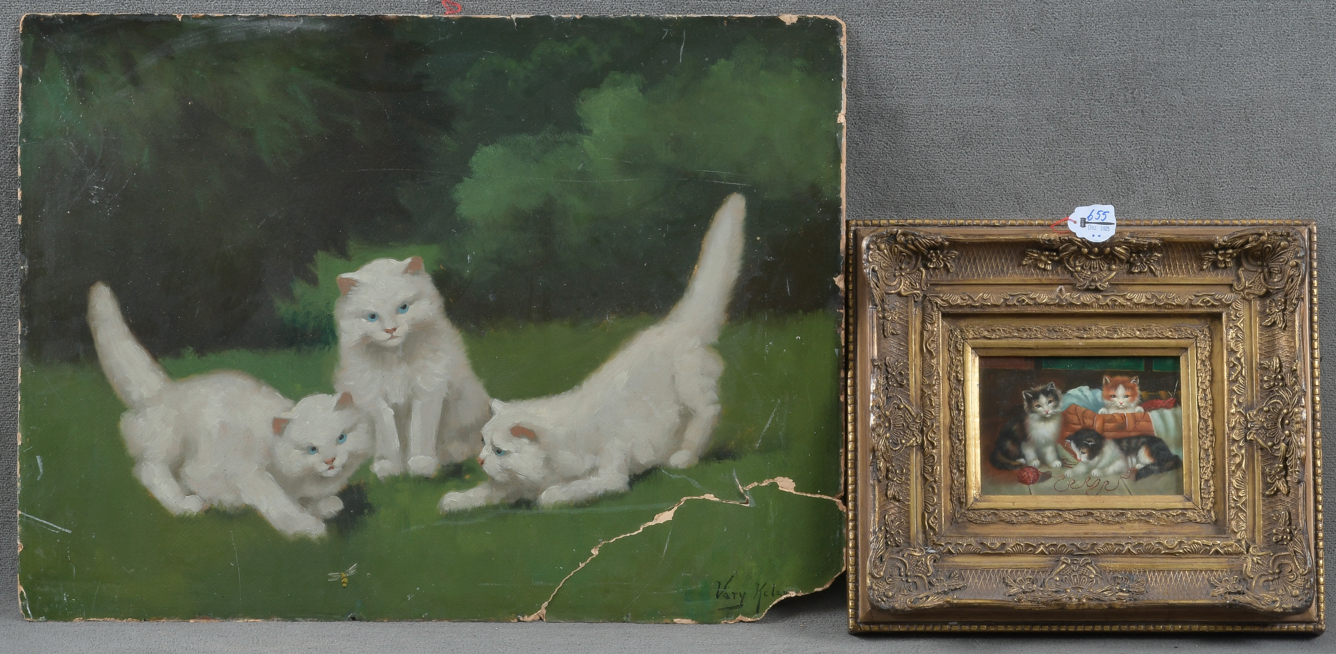 - Katalog-Nr: 655Maler des 19./20. Jhs. Spielende Katzen. Öl/Holz / Öl/Malkarton, eines gerahmt, 12 x 17 / 50,5 x 67,5 cm. (eines besch.)o.L.