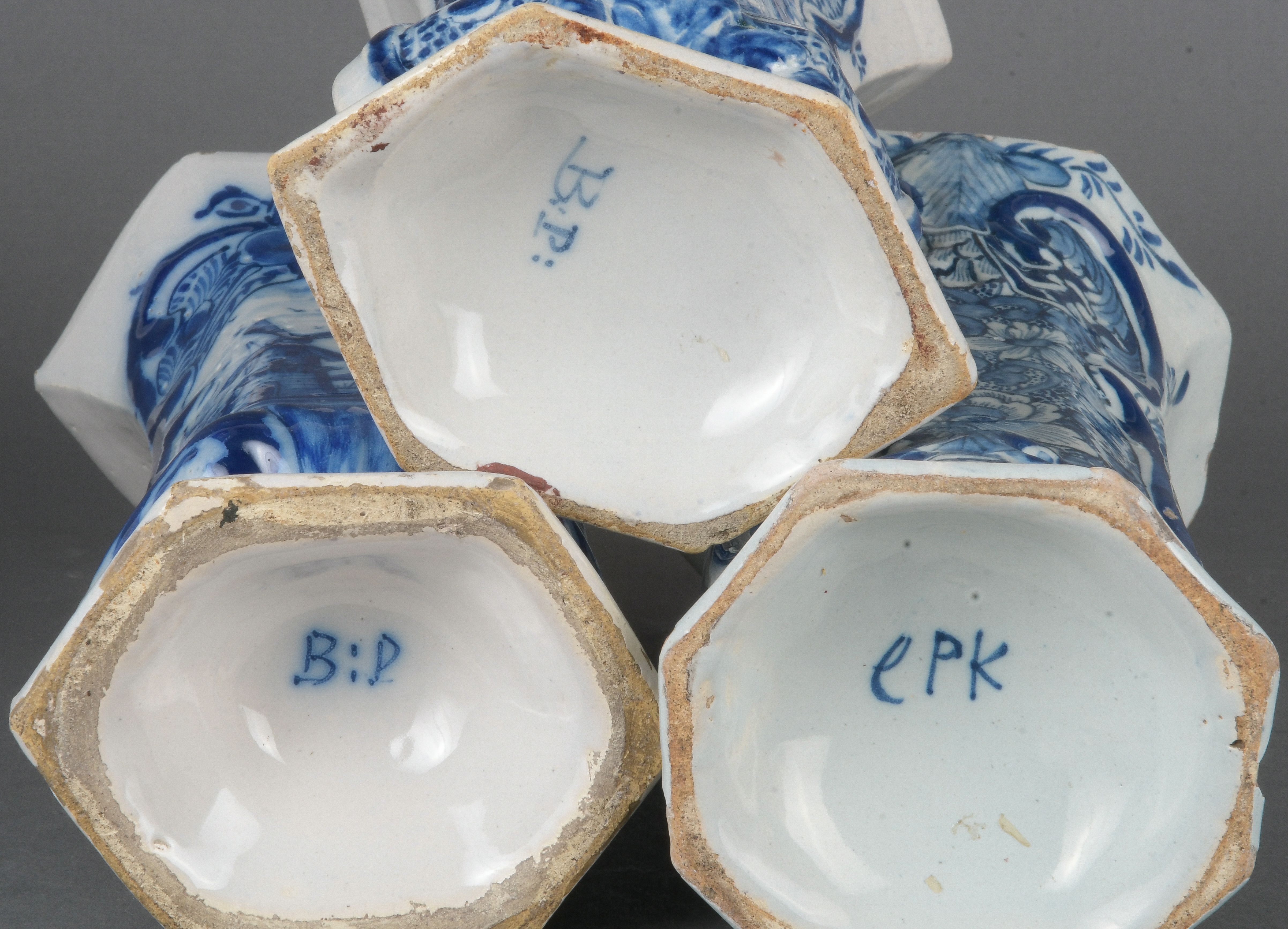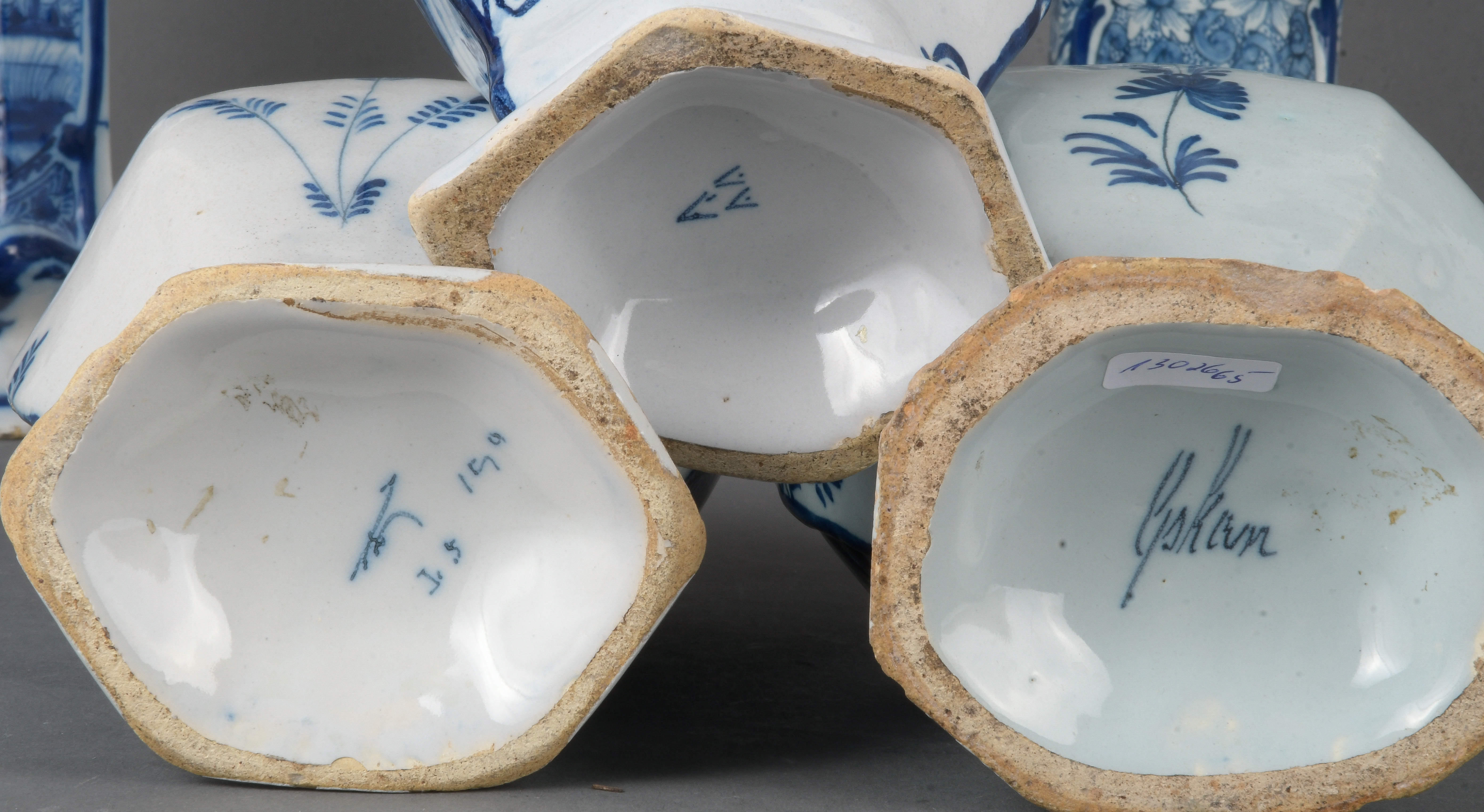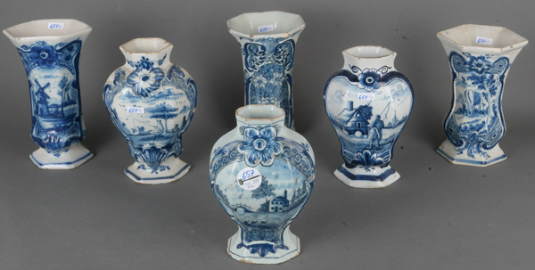 - Katalog-Nr: 657Konvolut von sechs Vasen. Delft 18./19. Jh. Fayence, unterglasurblau bemalt, teilw. am Boden gemarkt, H=21 bis 23 cm. (Deckel fehlen)o.L.
