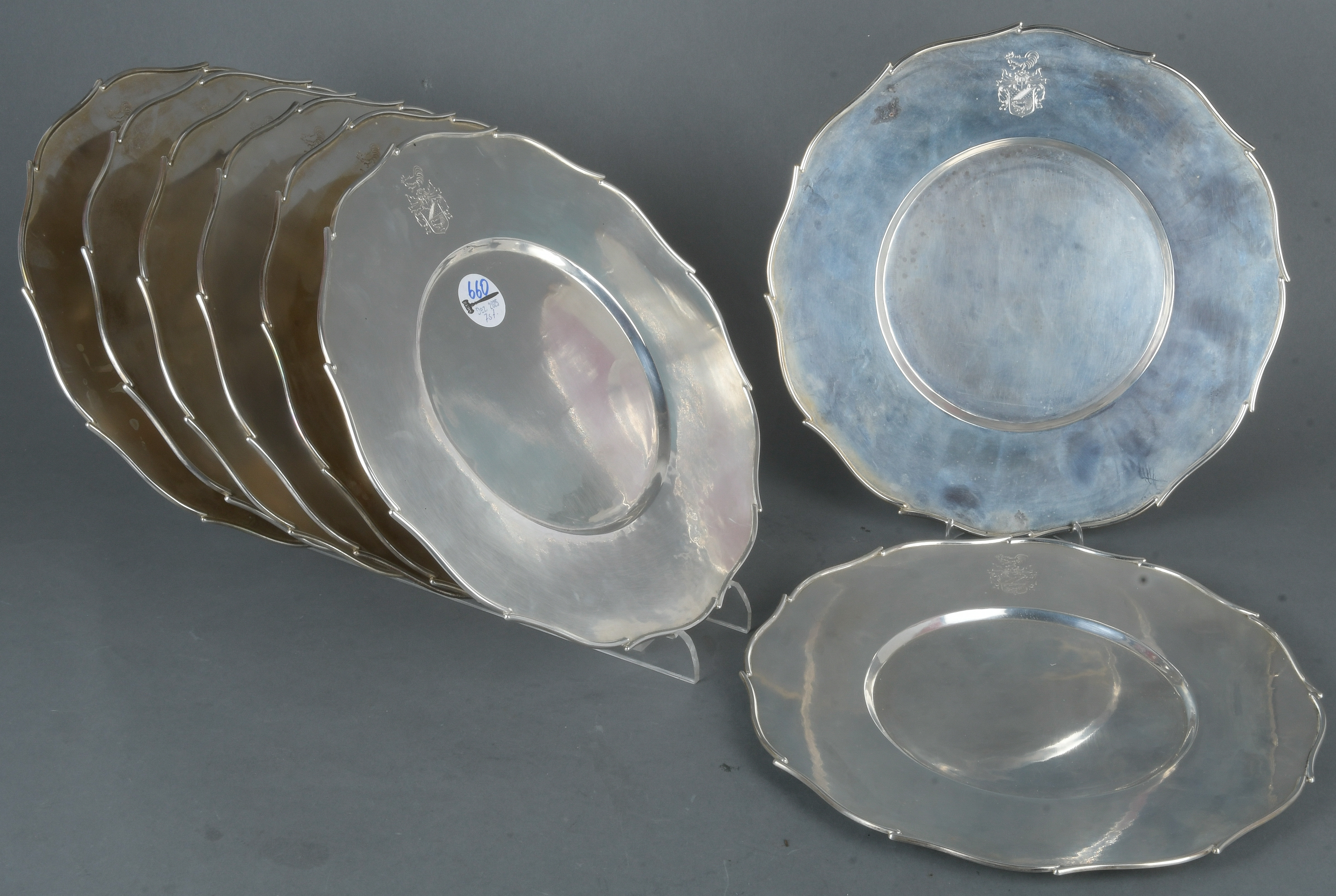 - Katalog-Nr: 660Acht Platzteller. Hamburg, H.J. Wilm 20. Jh. 925er Sterlingsilber, ca. 5.405 g, verso gepunzt mit Stadt- und Meistermarke, D=je 30,5 cm.o.L.