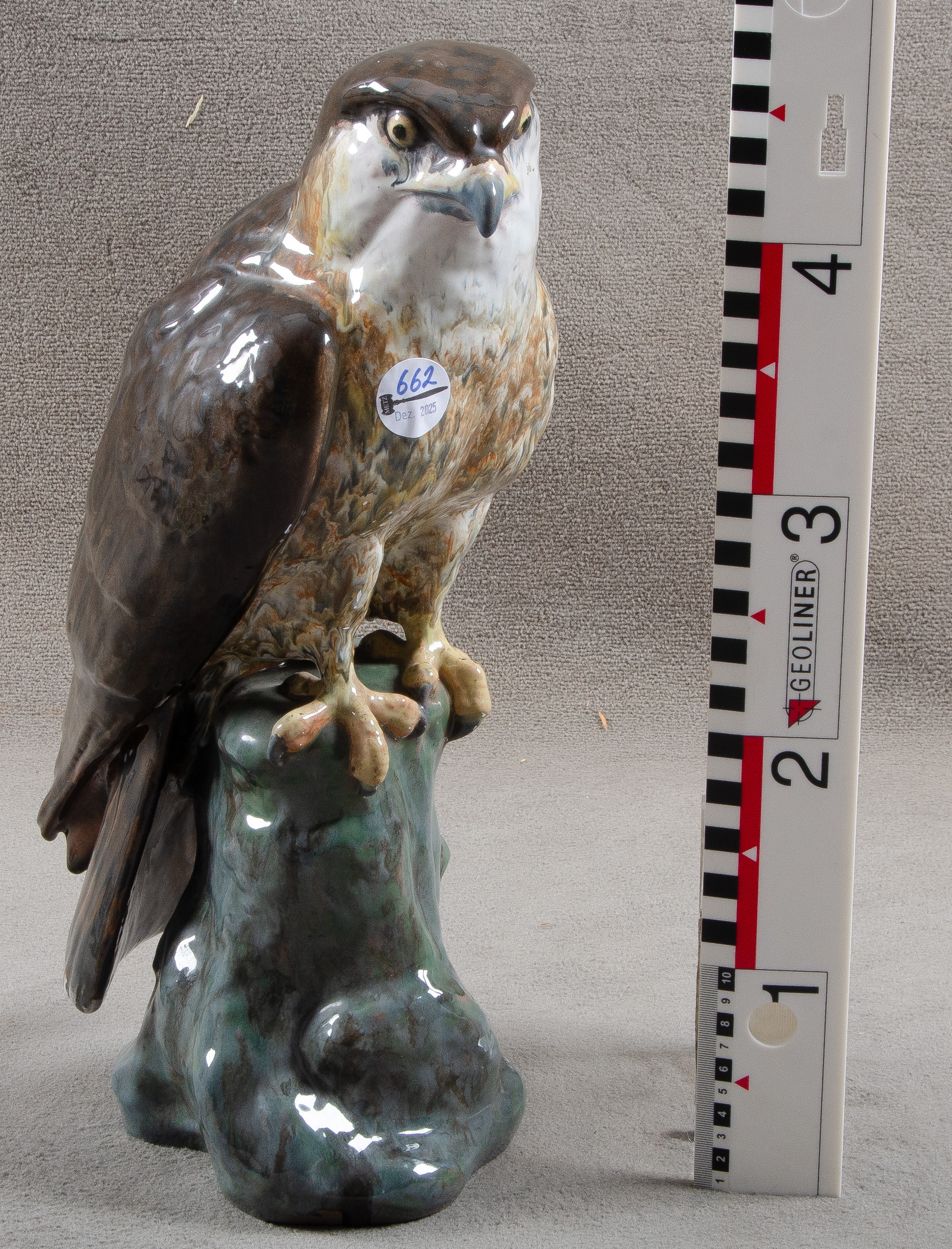 - Katalog-Nr: 662Bussard. Karlsruher Majolika 20. Jh. Irdengut, naturalistisch modelliert und staffiert; am Boden gemarkt, Entwurf von Emil Pottner, H=49 cm.o.L.