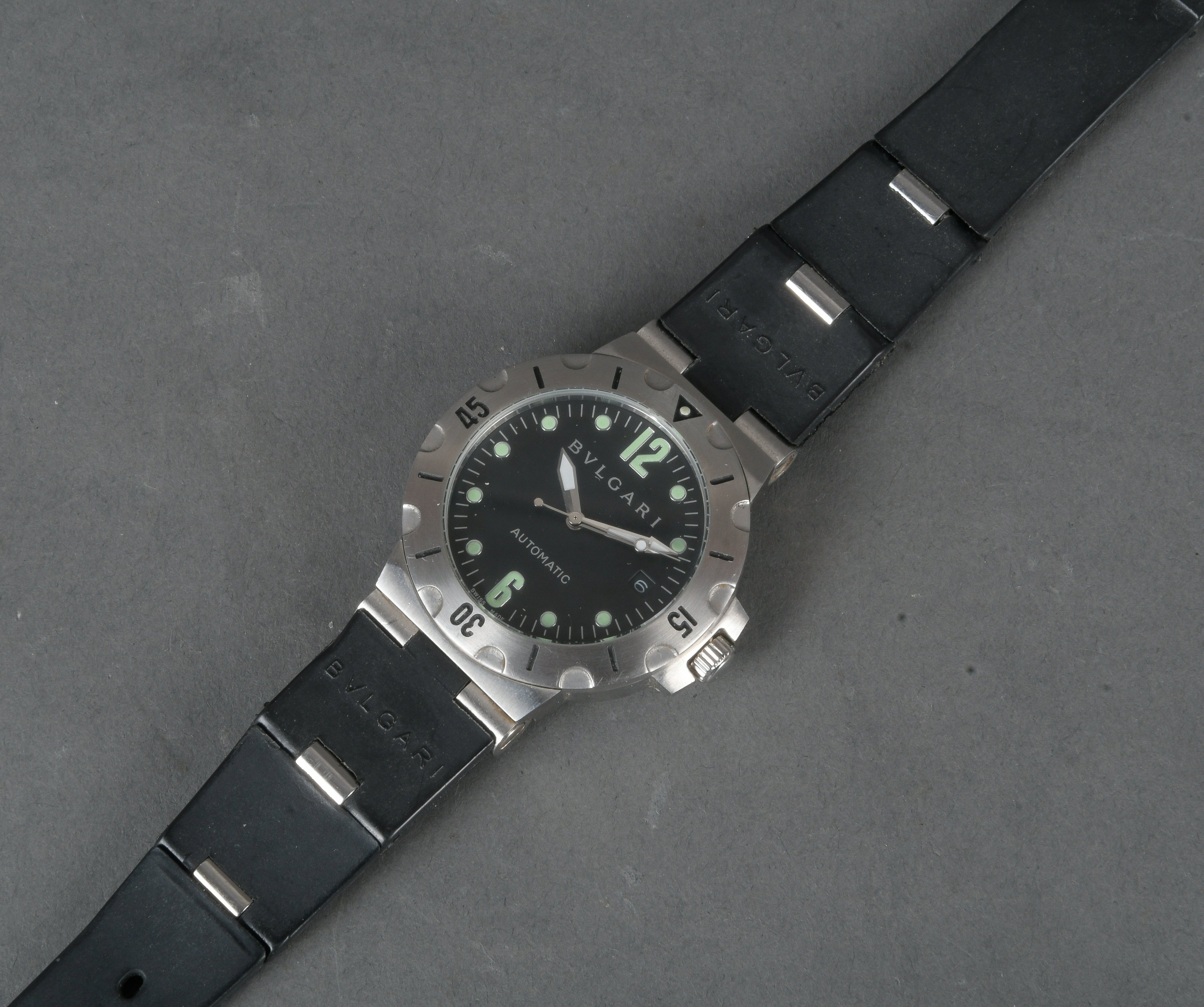 - Katalog-Nr: 671Armbanduhr „Bulgari“, Automatik, Edelstahl. (Funktion ungeprüft)o.L.