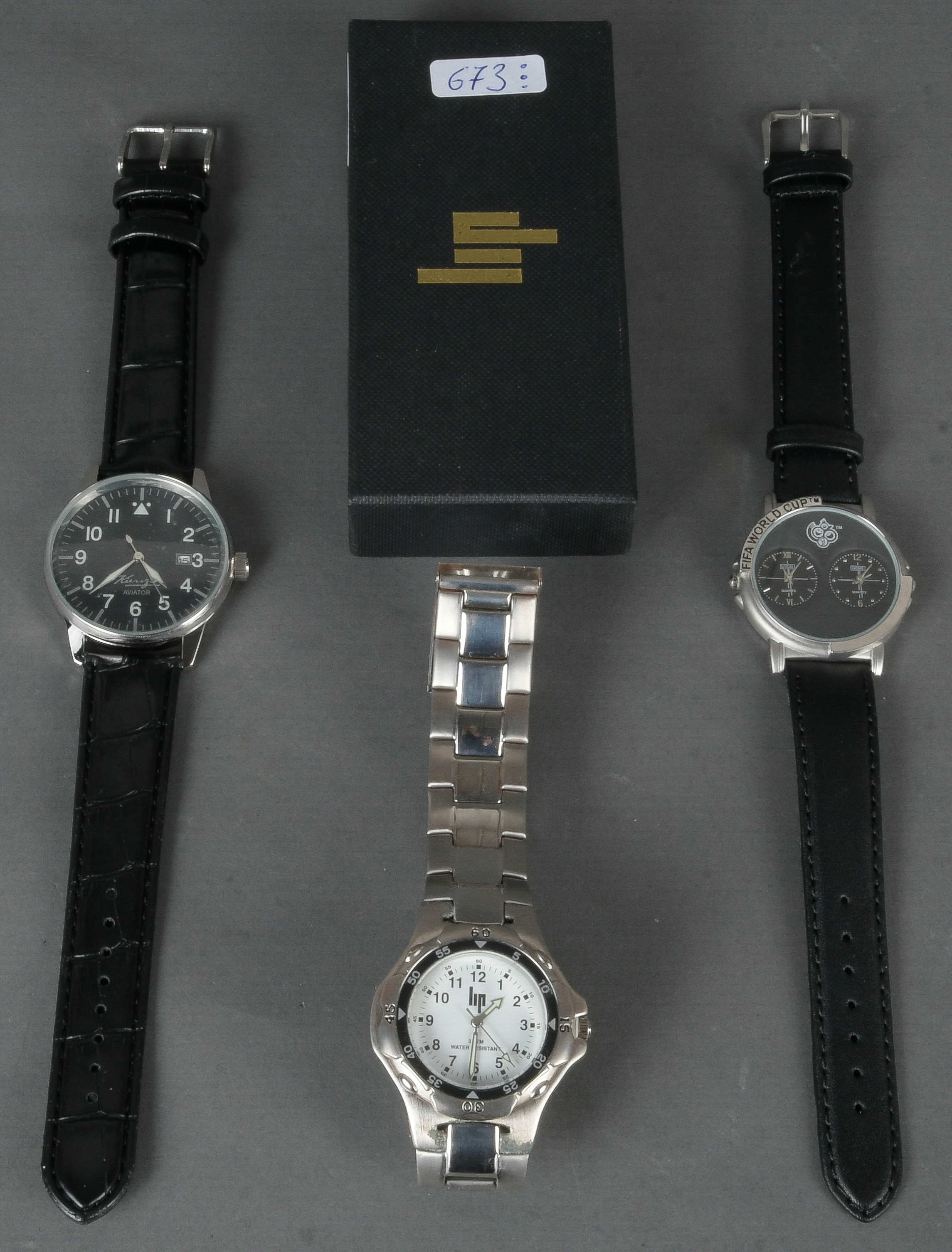 - Katalog-Nr: 673Drei Armbanduhren: „Bonflair“ anlässig der Fifa World Cup 2006, „Kienzle“ und „Lip“ in Original-Etui. (Funktion ungeprüft)o.L.