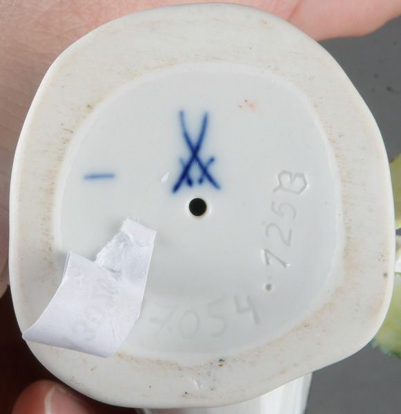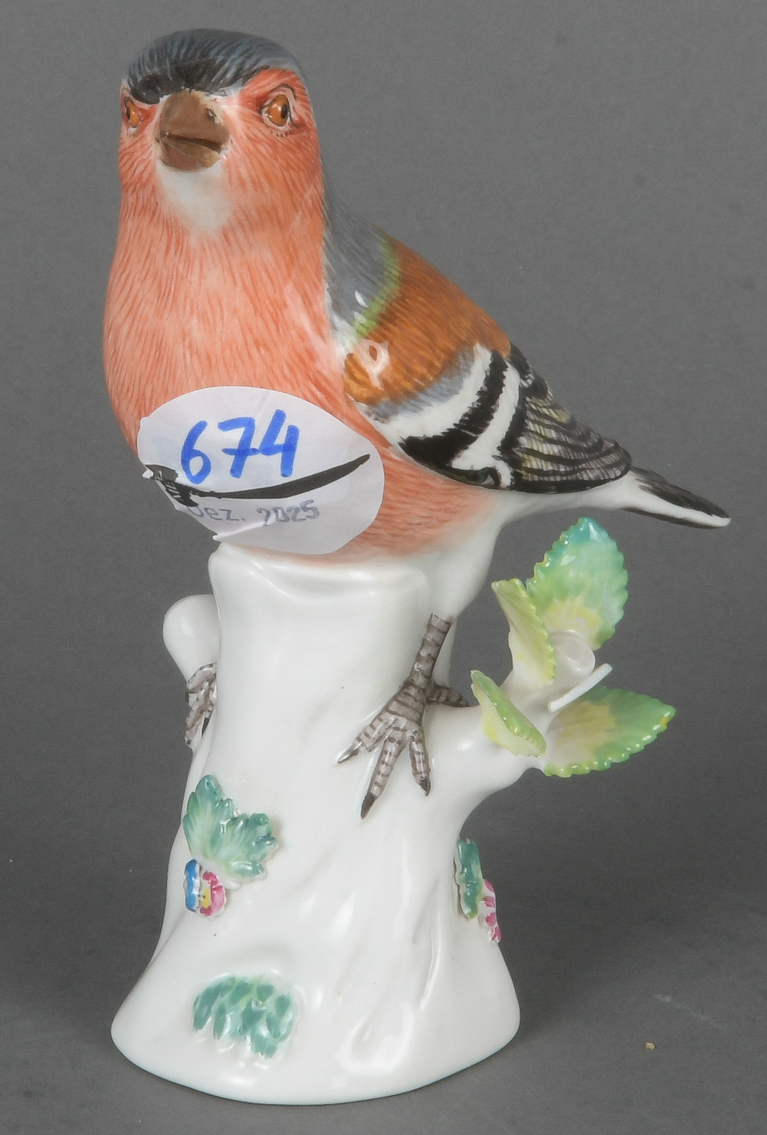- Katalog-Nr: 674Buchfink. Meissen 20. Jh. Porzellan, naturalistisch modelliert und staffiert; am Boden unterglasurblaue Schwertermarke, Modell nach Johann Joachim Kaendler, H=13,3 cm. (Blatt besch.)o.L.