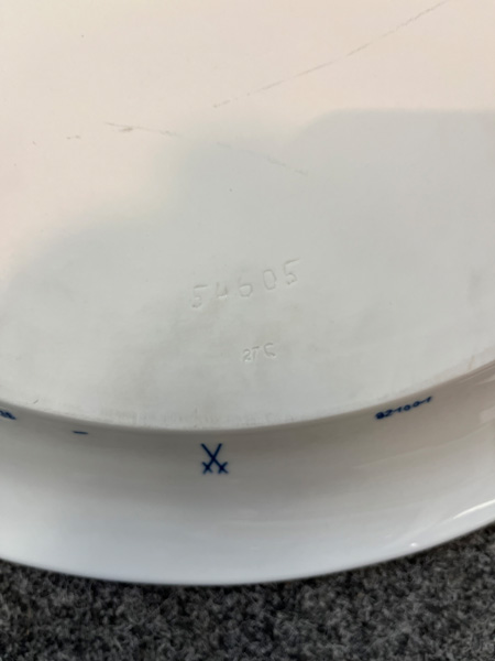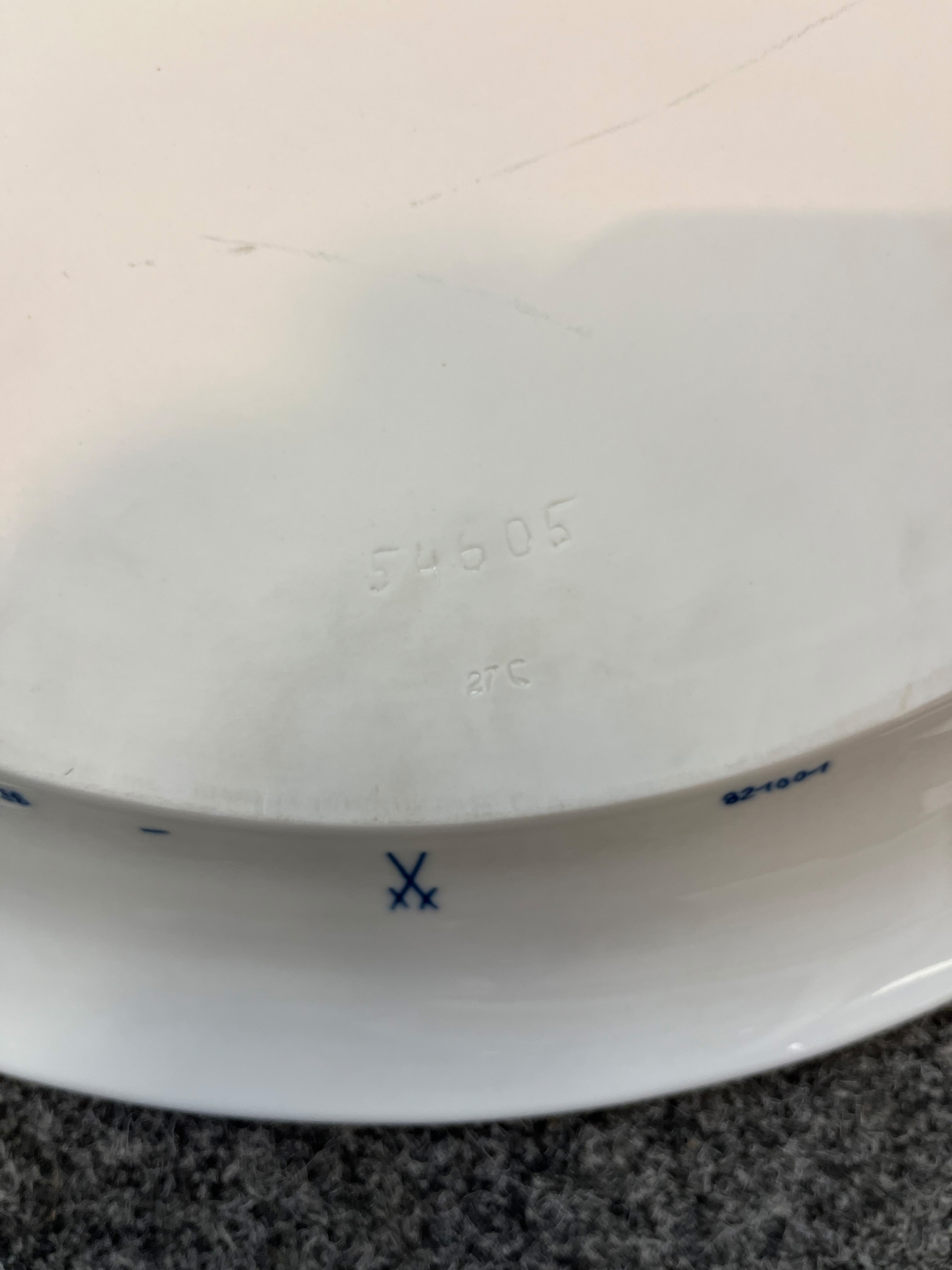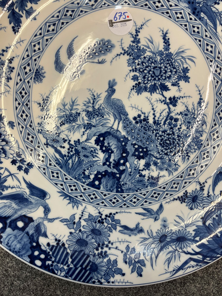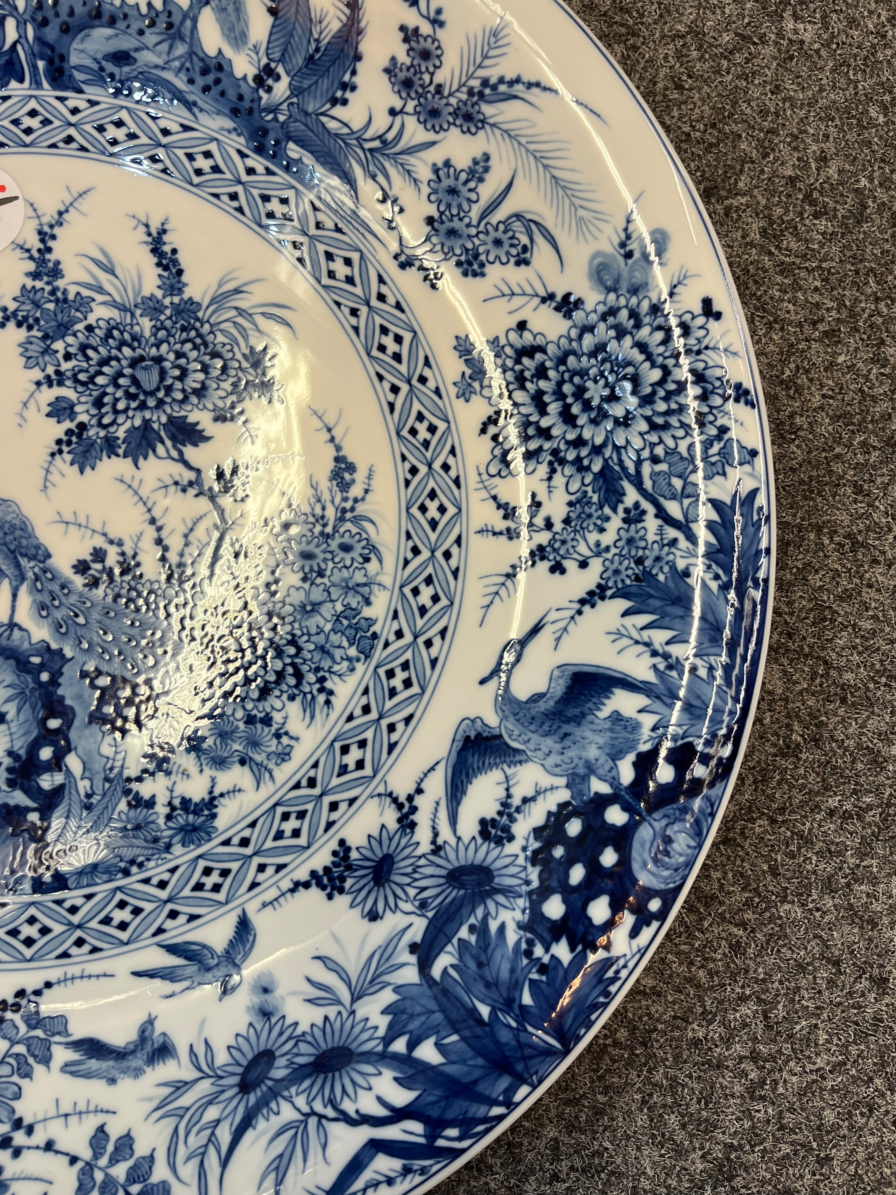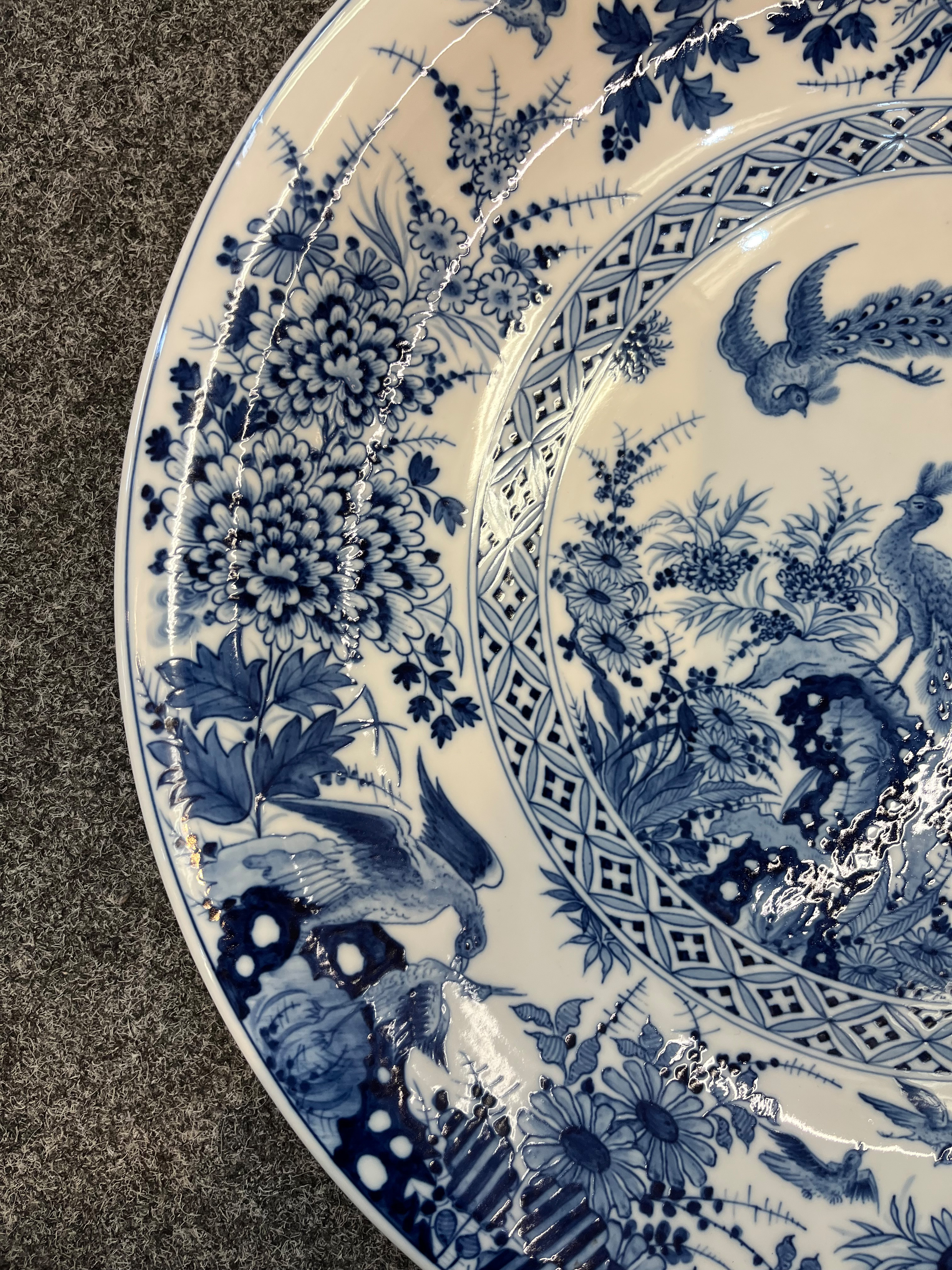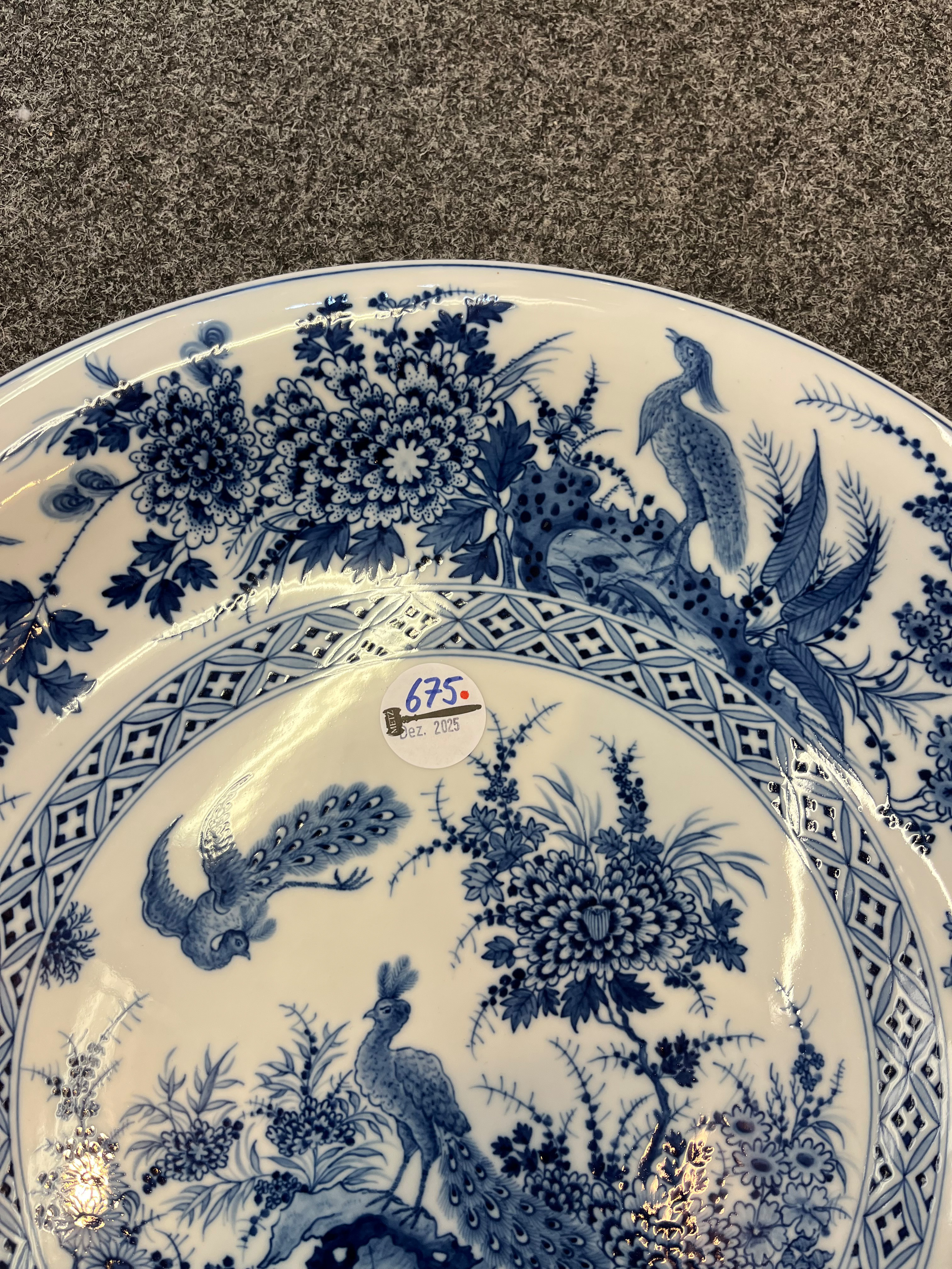 - Katalog-Nr: 675Große, runde Wandplatte. Meissen 20. Jh. Porzellan, unterglasurblau bemalt mit Floraldekor und Paradiesvögeln; verso unterglasurblaue Schwertermarke, D=46,5 cm.o.L.