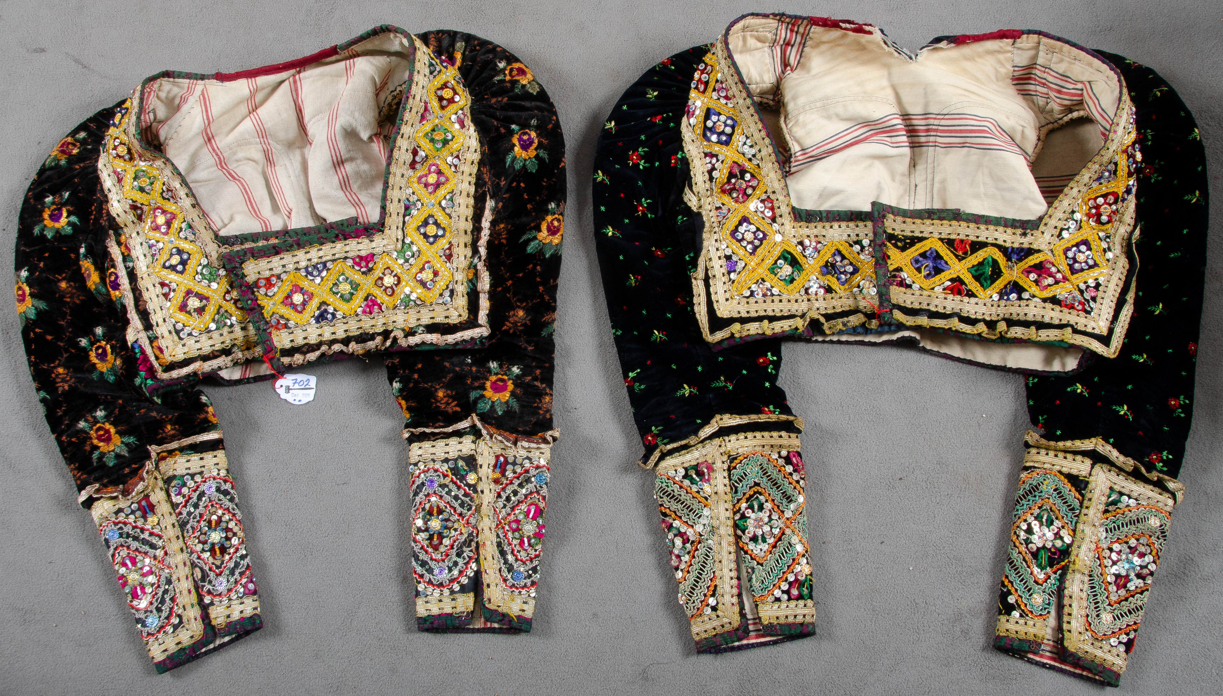 - Katalog-Nr: 702Zwei Trachtenjacken. Wohl Franken. Schwarzer Stoff, mit buntem und Goldfaden bestickt mit Blumen und Strasssteinen.o.L.