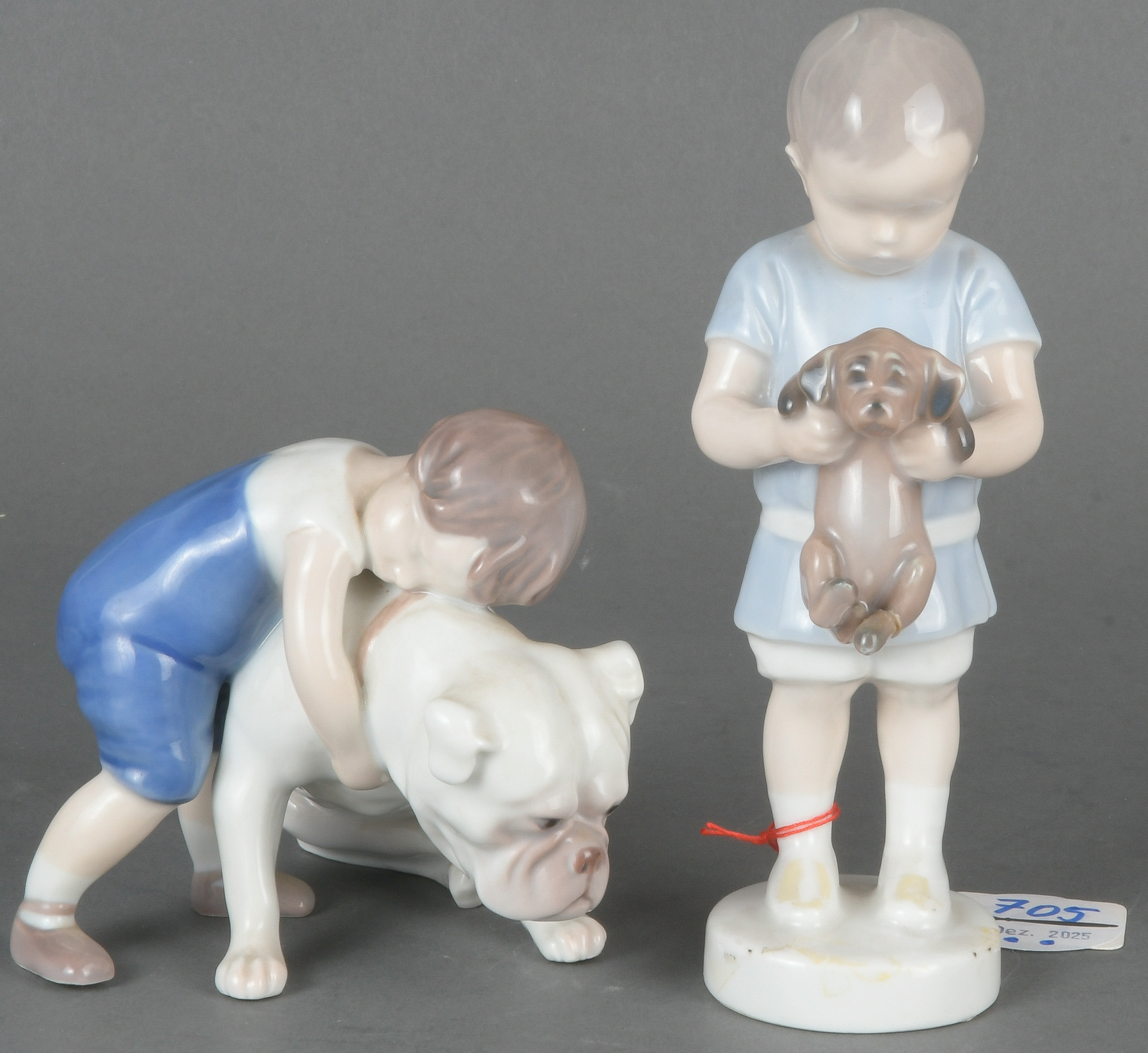 - Katalog-Nr: 705Knabe mit Dackel und Knabe mit Bulldogge. Bing & Grøndahl 20. Jh. Porzellan, bunt bemalt; am Boden gemarkt, mit Ziffer „1747“ / „1790 ML“,Entwurf von Ingeborg Plockross-Irminger, H=16,5 / 9,5 cmo.L.