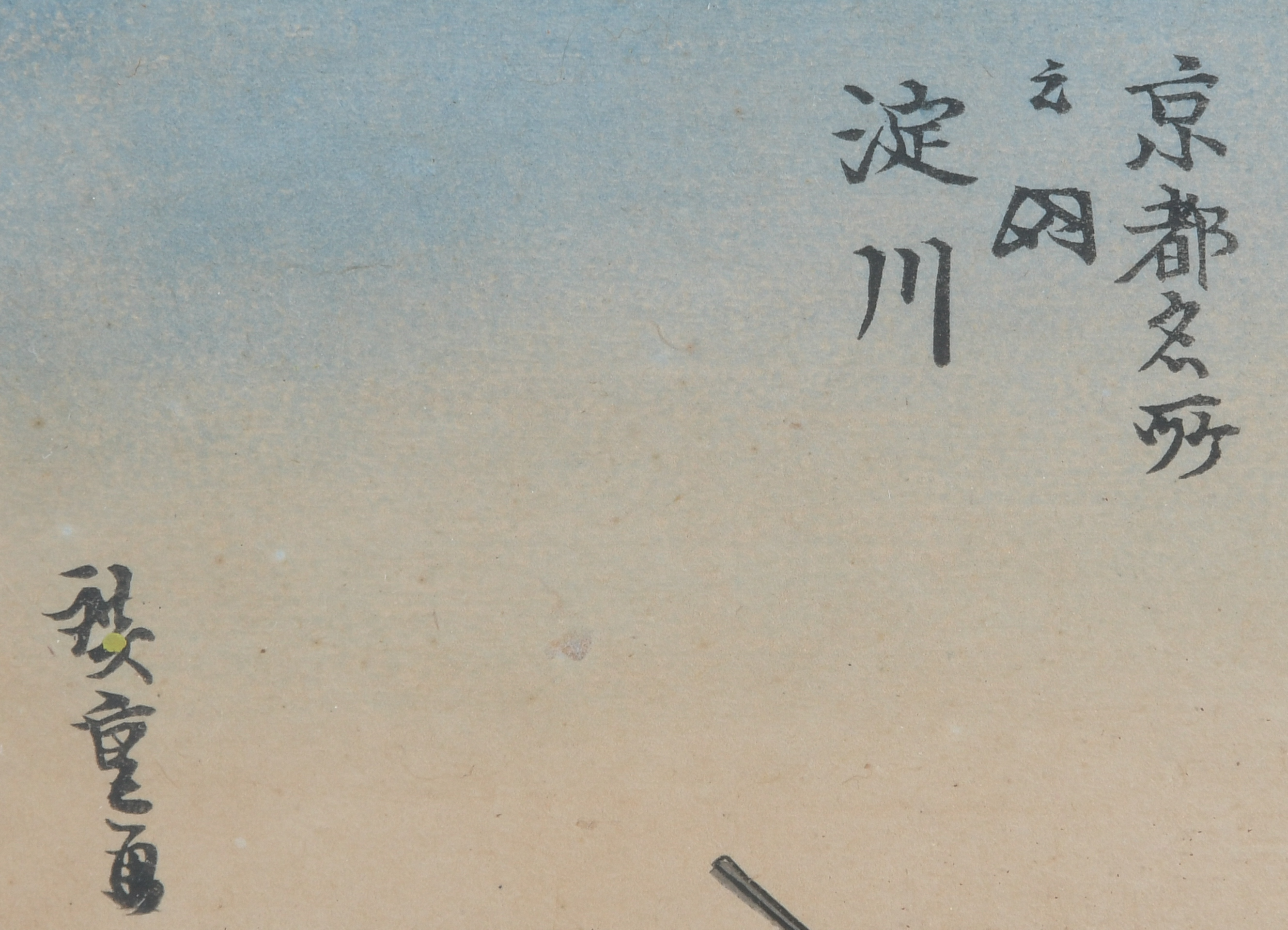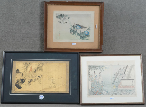 - Katalog-Nr: 706Asiatischer Graphiker des 20. Jhs. Zwei colorierte Holzschnitte mit Vögeln und Personen in Landschaft, re./u./sign.; dazu ein Seidenbild, je hi./Gl. gerahmt, 17,5 x 24,5 bis 21,5 x 38 cm.o.L.