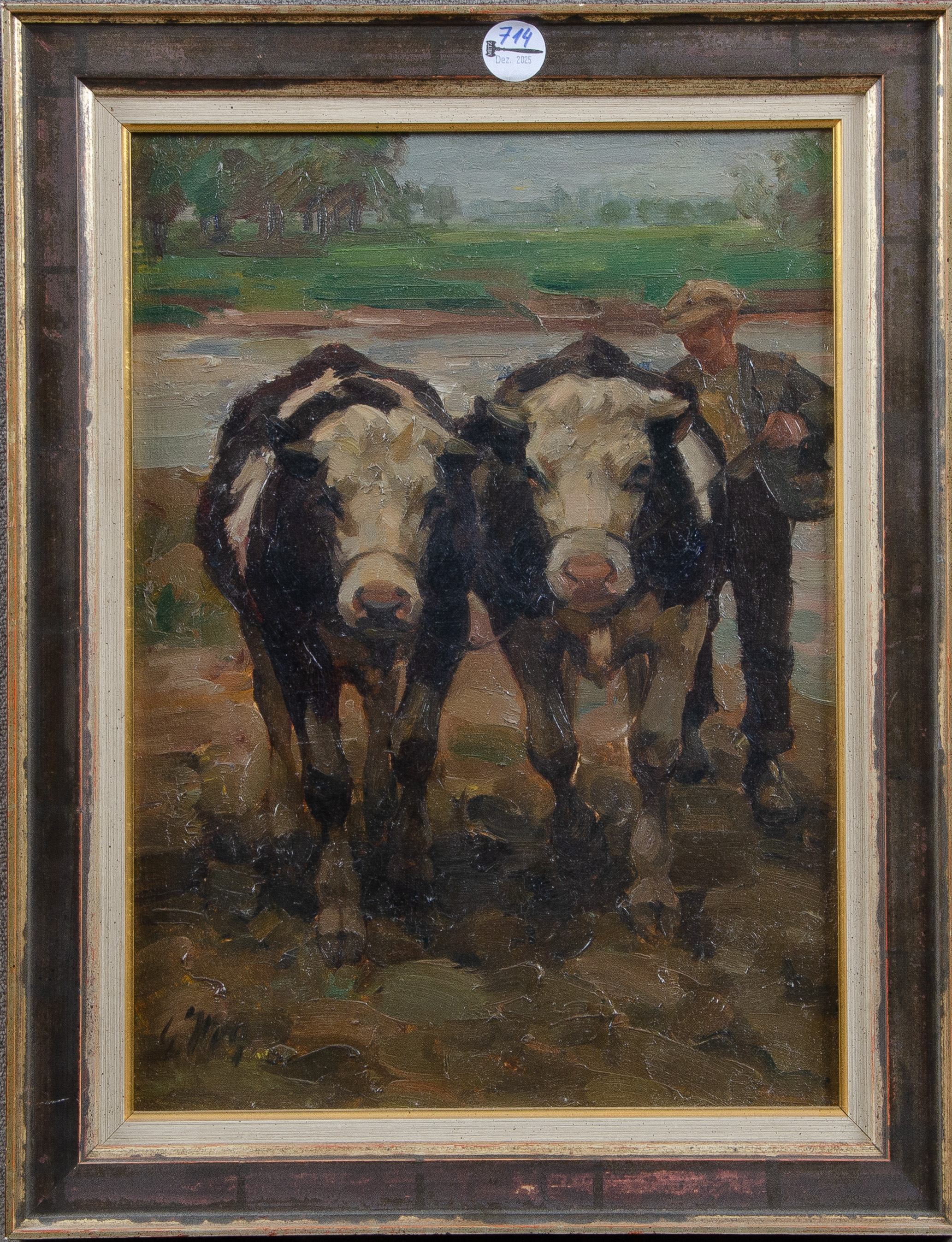 - Katalog-Nr: 714Georg Wolf (1882-1962). Bauer mit zwei Rindern auf dem Feld. Öl/Lw., li./u./sign., gerahmt, 50 x 37 cm.o.L.