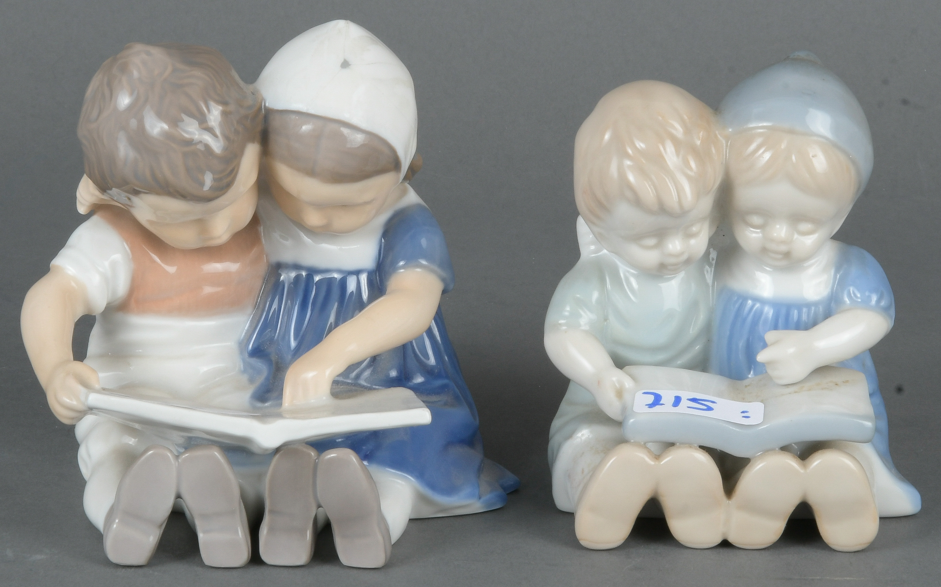 - Katalog-Nr: 715Zwei Kinderpaare mit Kinderbuch. Bing & Grøndahl 20. Jh. Porzellan, bunt bemalt; eine am Boden gemarkt, mit Ziffer „1562“, H=8,9 / 9,4 cmo.L.