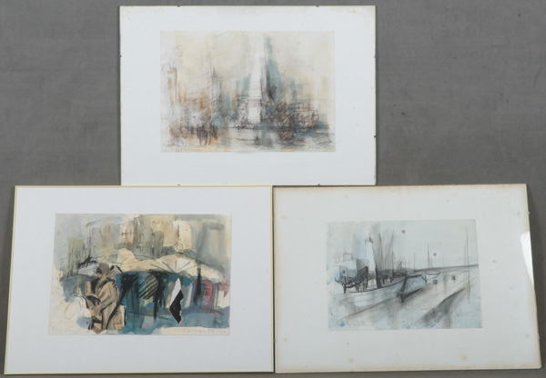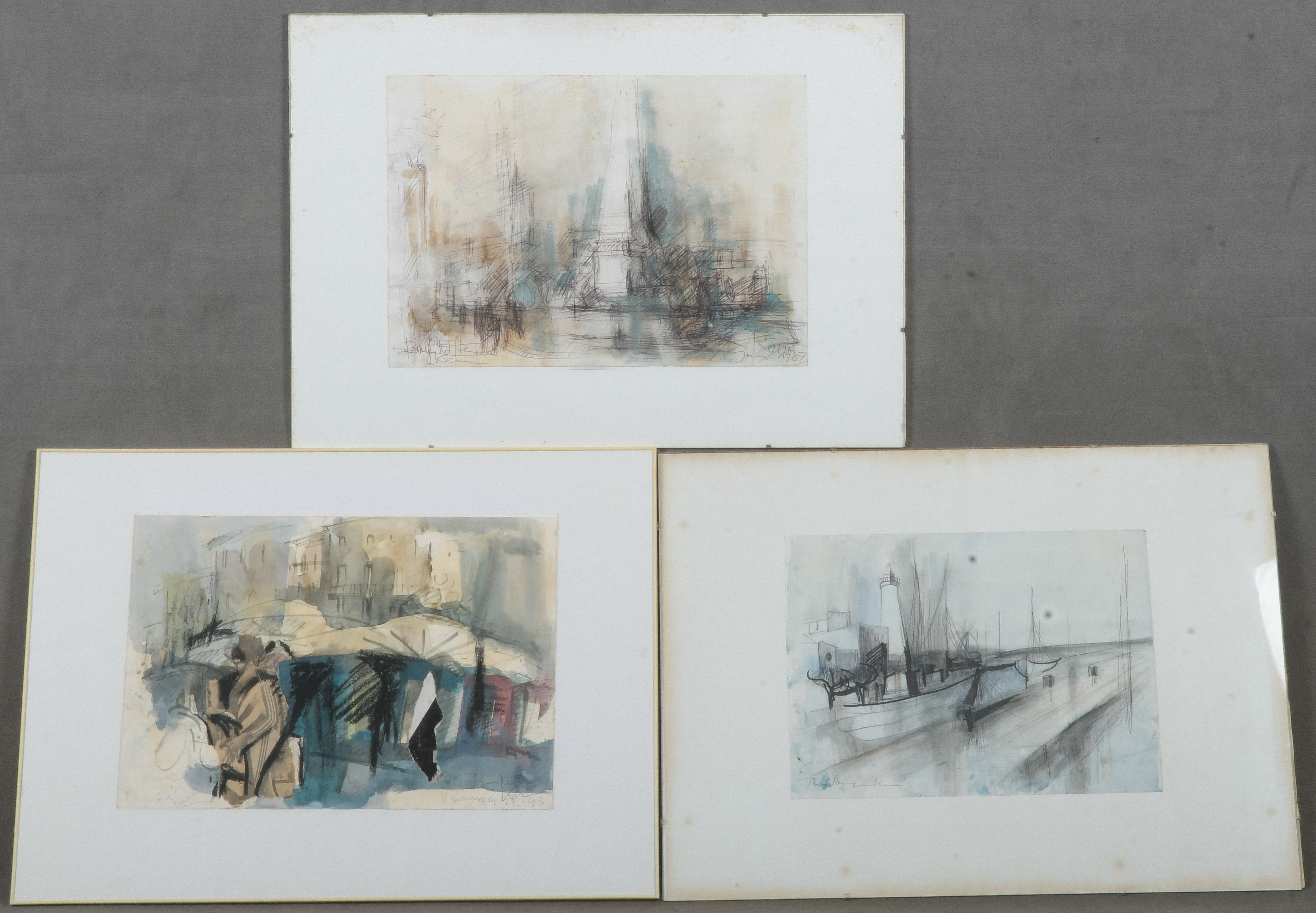 - Katalog-Nr: 719Brigitte Heiliger-Kramm (1919-2001). Ansichten von „Rom“, „Venedig“ und „Viareggio“. Mischtechnik / Collage, re. bzw. li./u./sign. (19)87 / (19)92 / (19)93, mit Passepartout, teilw. hi./Gl. gerahmt, je 32,5 x 48 cm.o.L.