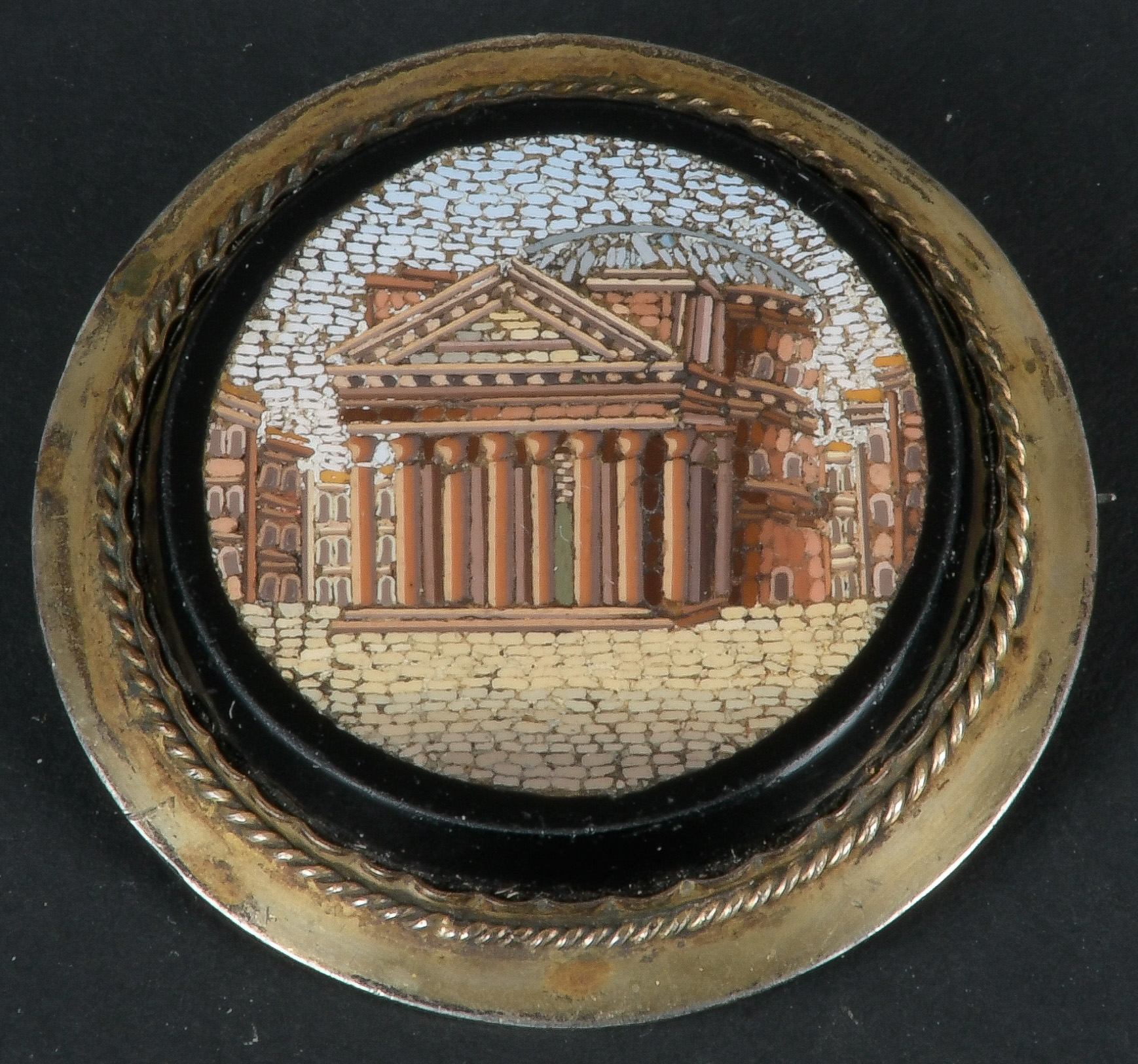 - Katalog-Nr: 721Brosche, besetzt mit Onyx und Mosaik mit Ansicht des Pantheon in Pietra-Dura-Technik.o.L.