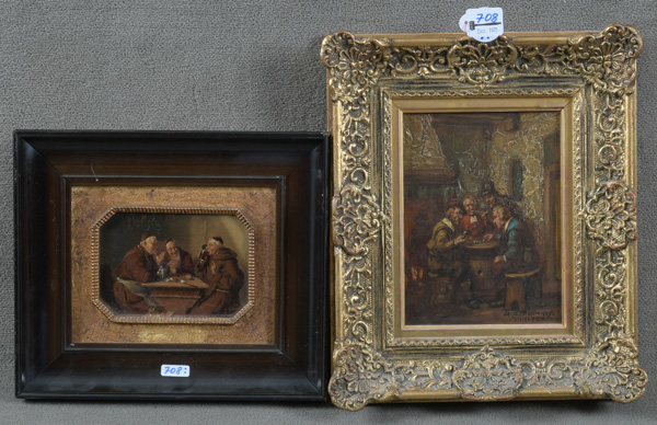 - Katalog-Nr: 708Maler des 20. Jhs. Zwei Wirtshausszenen. Öl/Lw. / Öl/Holz, re./u./sign., gerahmt, 10 x 14,5 / 20,5 x 15,5 cm.o.L.