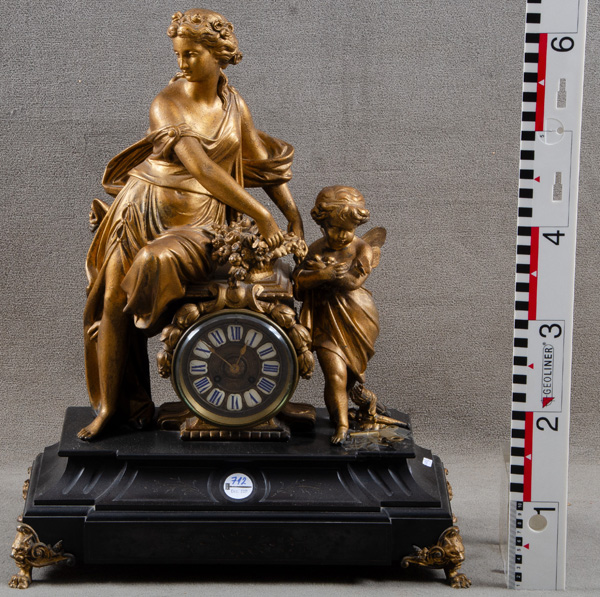 - Katalog-Nr: 712Historismus-Tischuhr. Frankreich 20. Jh. Weißbronze / schwarzer Marmorsockel, auf Klauenfüßen; darauf ruhende, weibliche mythologische Figur mit Putto und rundem Uhrengehäuse, H=61 cm, B=50 cm, T=22 cm. (Funktion ungeprüft)o.L.