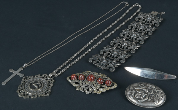 - Katalog-Nr: 723Konvolut Schmuck: Ein Armband, drei Broschen und zwei Halsketten mit Anhänger (L=60 cm). Silber, ca. 150,00 g, L=19 bis 50 cm.o.L.