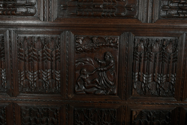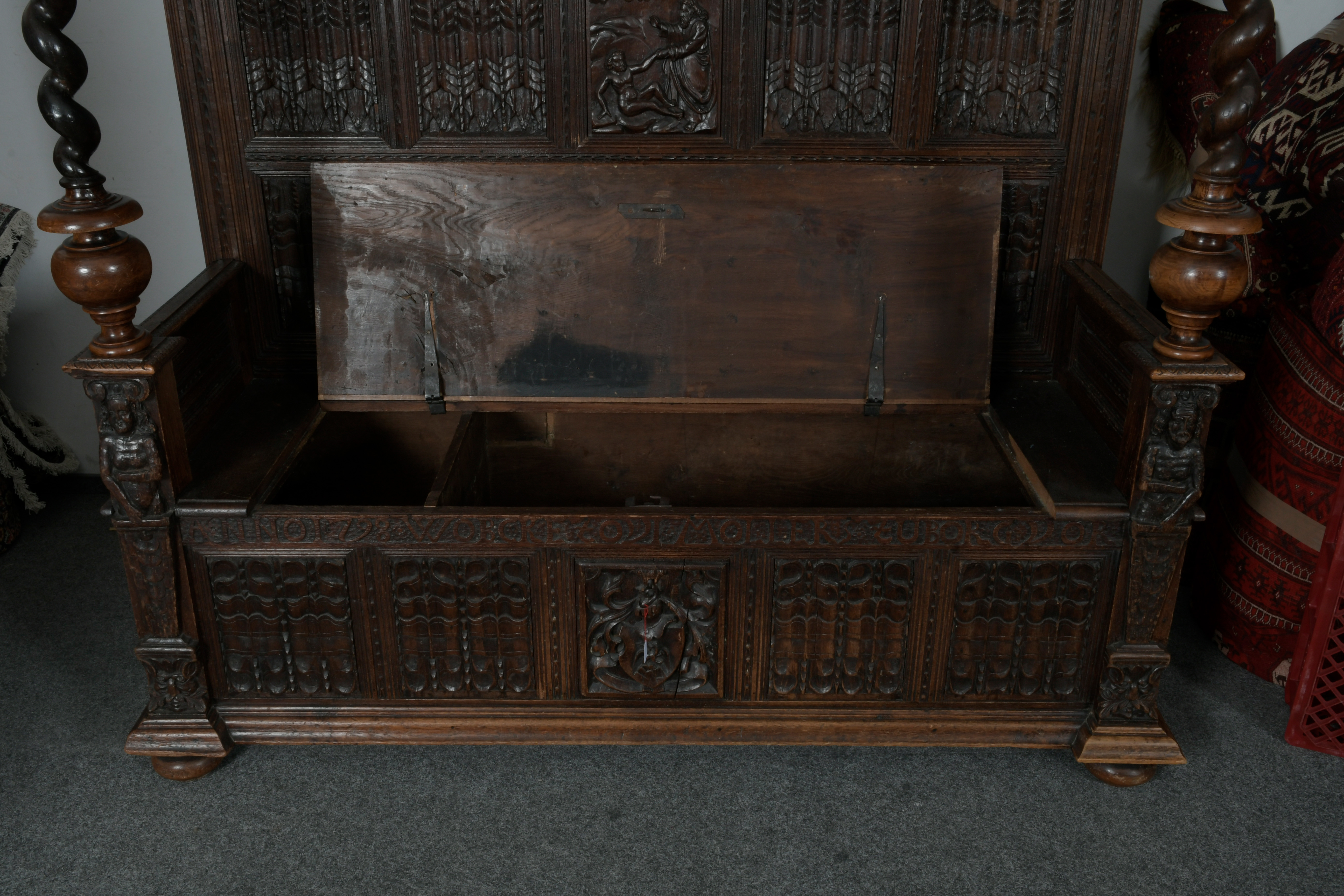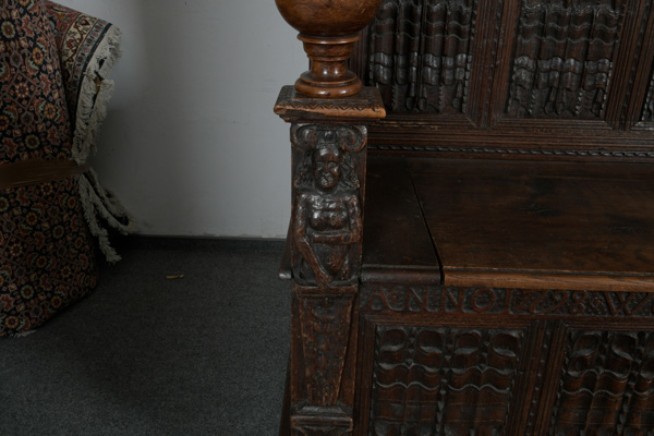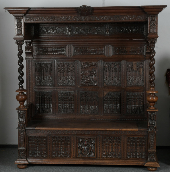 - Katalog-Nr: 76Kirchengestühl. Wohl Norddeutschland 19. Jh. Massiv Eiche, geschnitzt mit figürlichen Szenen, Faltwerk, Maskaronen, teilw. gedrechselt; Kugelfüße, profilierter Sockel, Truhenbank flankiert von Säulen, darüber rechts und links Schübe, verkröpftes Gesims, reich verzierte Rückwand und Himmel, H=202 cm, B=195 cm, T=70 cm. (mit Ergänzungen)o.L.