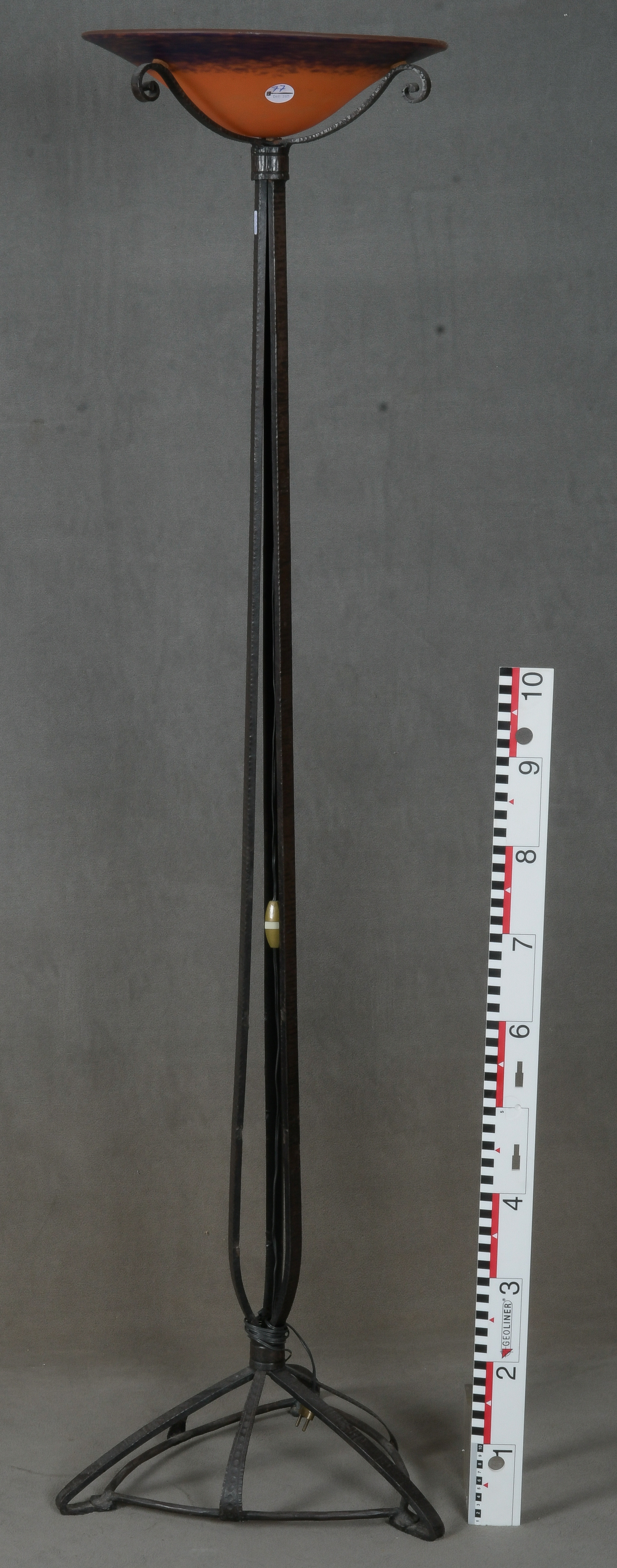 - Katalog-Nr: 77Art Déco-Stehlampe. Frankreich, Schneider 20. Jh. Schmiedeeisernes Gestell mit rundem, farbig überfangenem Glasschirm; dreipassiger Fuß, Schaft mit drei sich nach oben verjüngenden Stäben, gebogene Schalenhalterung mit eingerollten Schnecken, am Schirm sign., H=170 cm, D=40 cm.o.L.