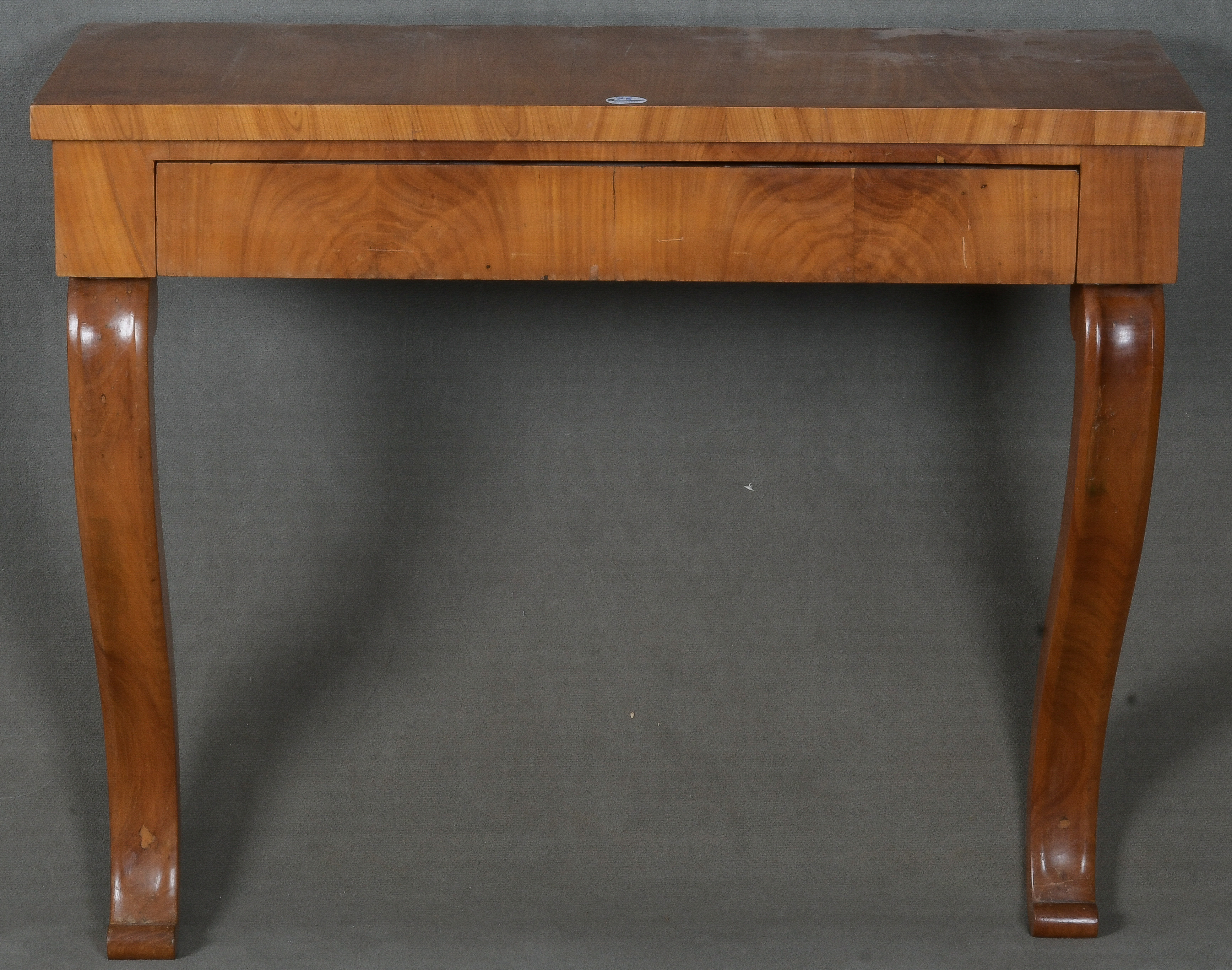 - Katalog-Nr: 78Spätbiedermeier-Konsole. Deutsch 19. Jh. Kirschbaum furniert; S-förmig geschwungene Beine, einschübiger Tischkasten, leicht überstehende Platte, H=72 cm, B=89 cm, T=38 cm.o.L.