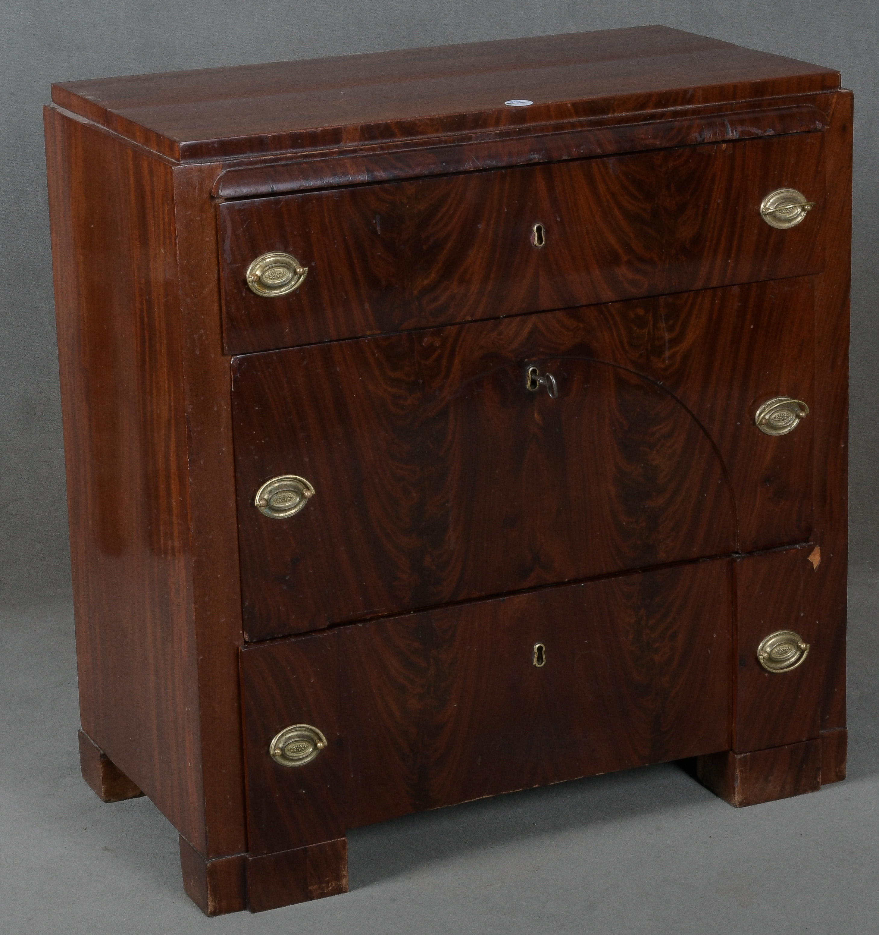 - Katalog-Nr: 79Biedermeier-Kommode. Norddeutschland 19. Jh. Mahagoni furniert; Klotzfüße, dreischübige, leicht vorgesetzte Front mit halbrundem Stab, mittig halbrunder Ausschnitt, gerade Seiten, zurückgesetzte, gerade Platte, H=88 cm, B=83,5 cm, T=45 cm.o.L.