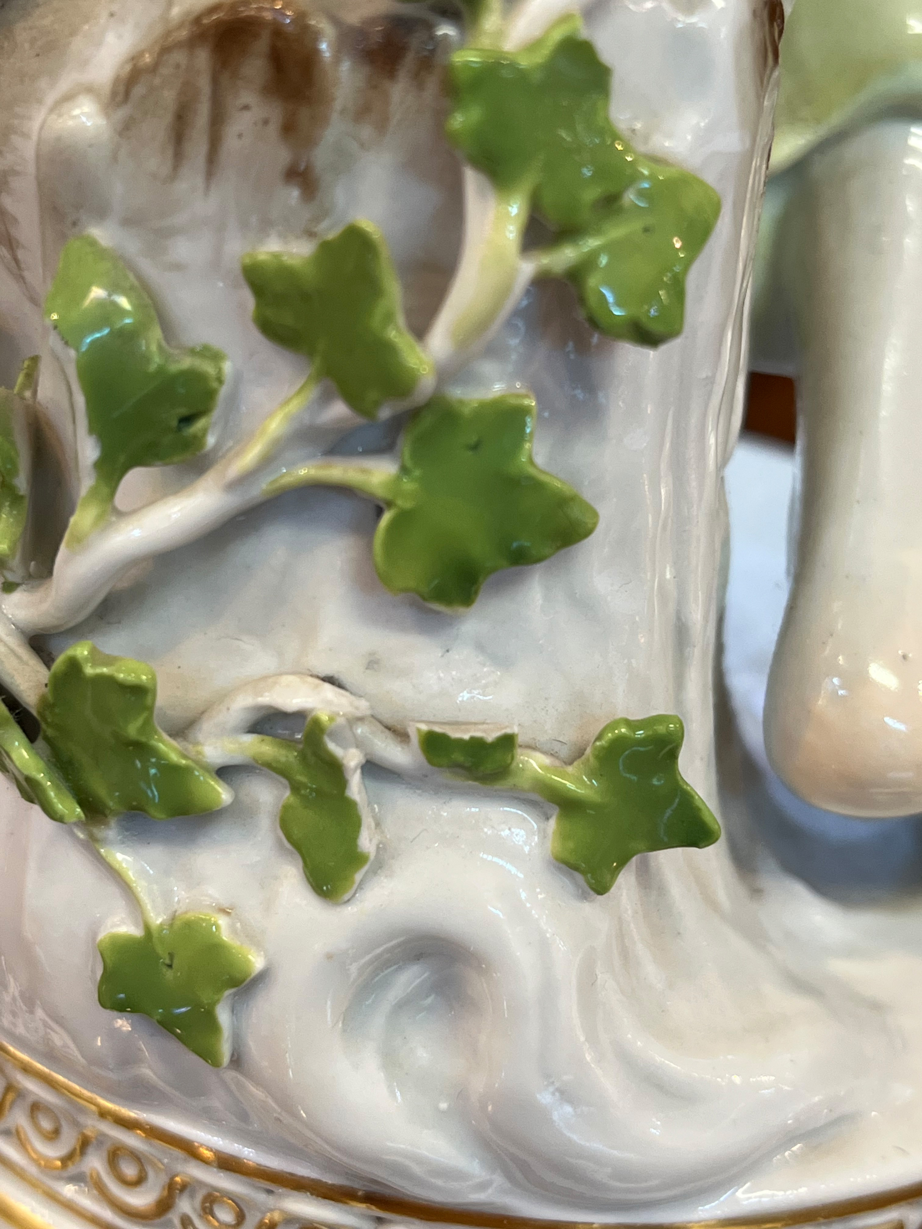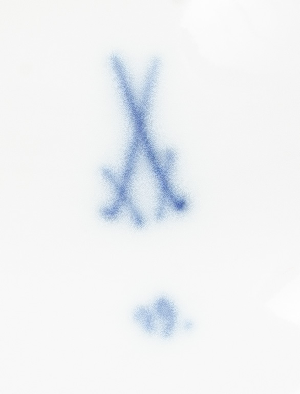 - Katalog-Nr: 100Große Schlangenhenkelvase. Meissen Pfeifferzeit 1924–34. Porzellan, mit kobaltblauem Fond, gelb staffierten Rändern und Golddekor, Schauseite bunt bemalt mit Blumenbouquet; am Boden unterglasurblaue Schwertermarke, Modell von Ernst August Leuteritz, H=48,5 cm. (min. best.)o.L.