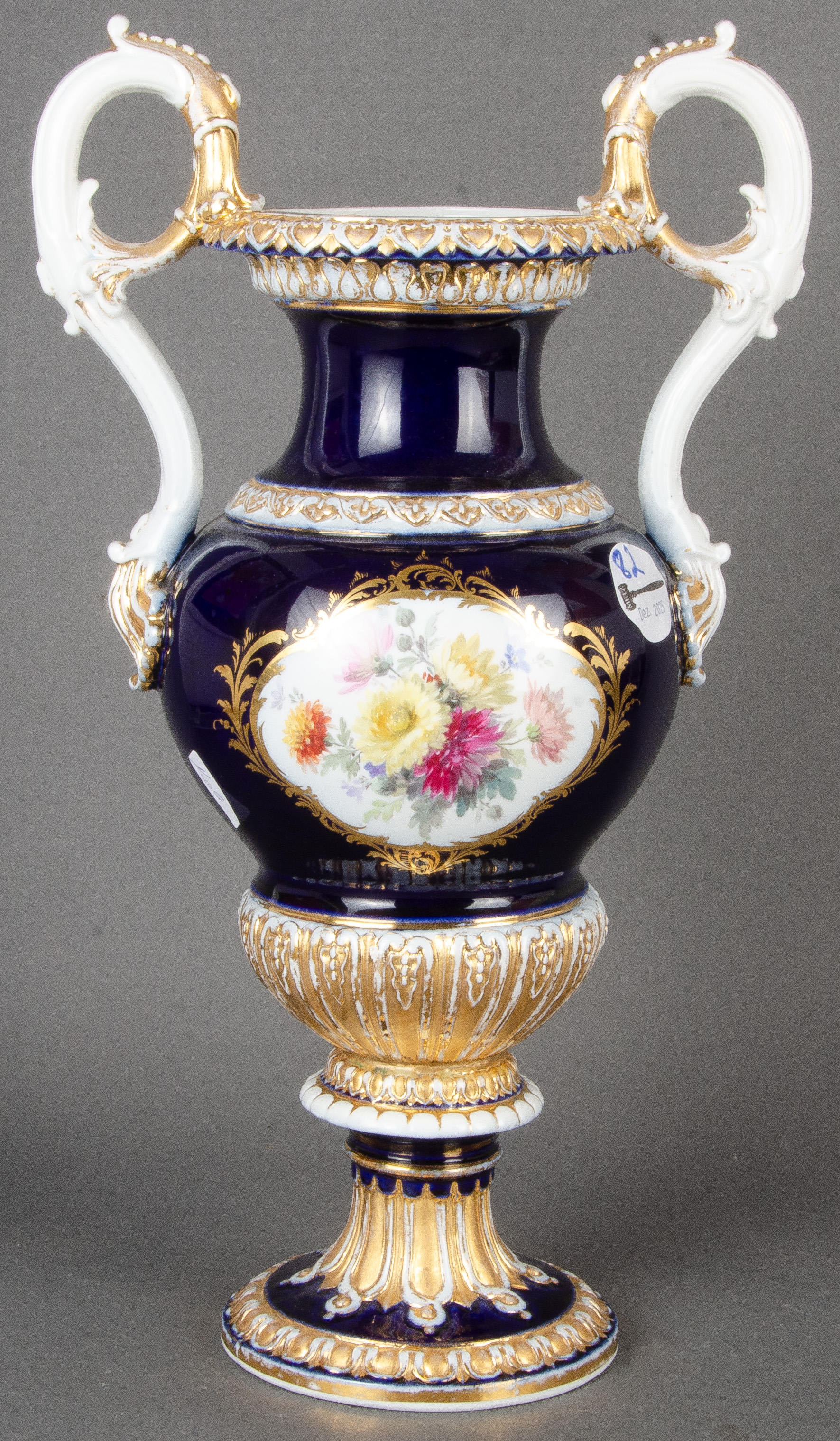 - Katalog-Nr: 82Doppelhenkelvase. Meissen 19. Jh. Porzellan, mit kobaltblauem Fond, Goldrändern und Golddekor, Schauseite bunt bemalt mit Blumenbouquet; am Boden unterglasurblaue Schwertermarke, Modell von Ernst August Leuteritz, H=41 cm.o.L.
