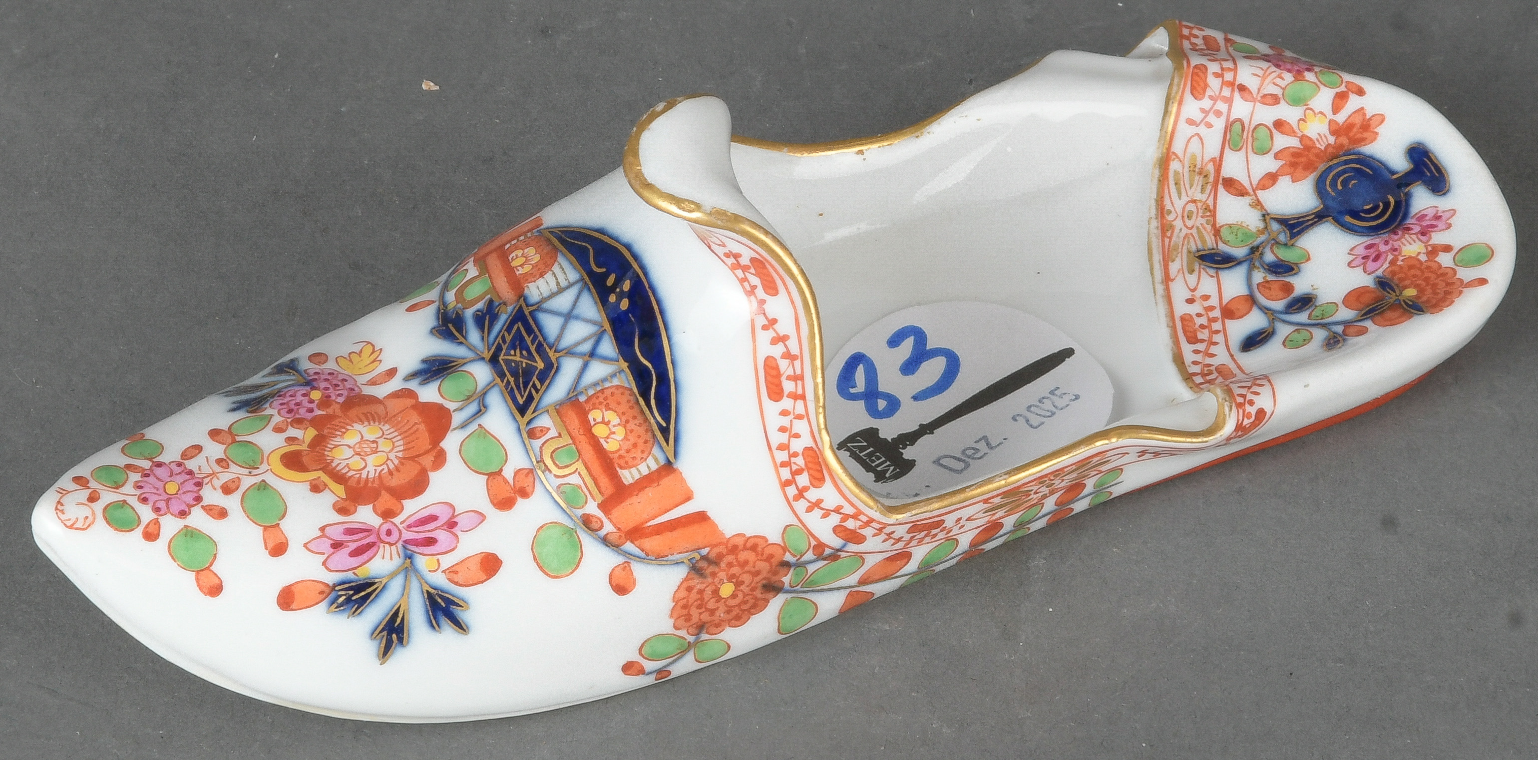 - Katalog-Nr: 83Pantoffel „Tischchenmuster“. Meissen 19. Jh. Porzellan, bunt bemalt und gold überdekoriert; am Boden unterglasurblaue Schwertermarke, H=5,5 cm, L=16 cm, T=5,4 cm.o.L.