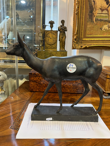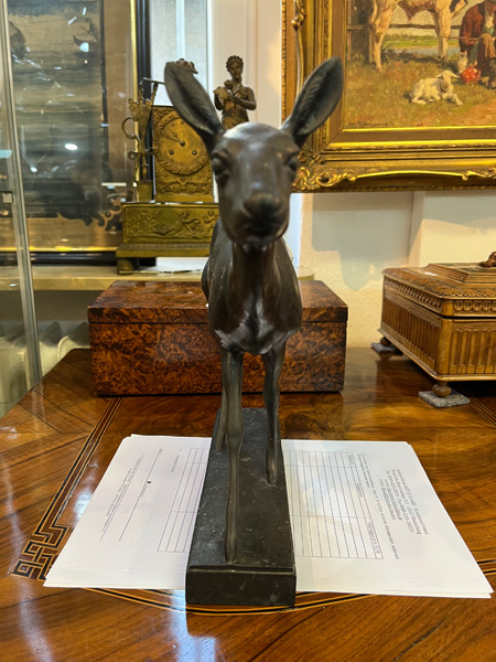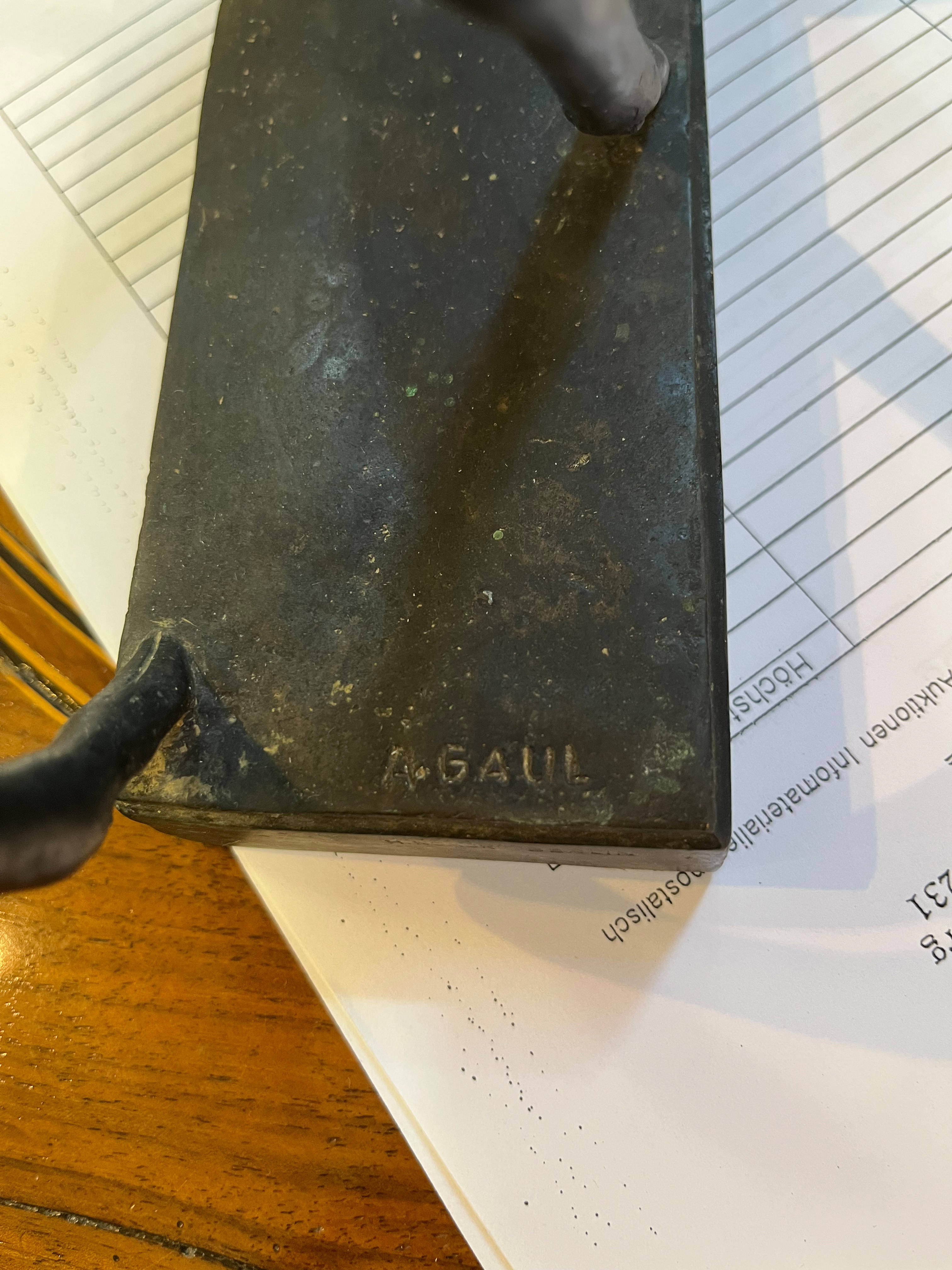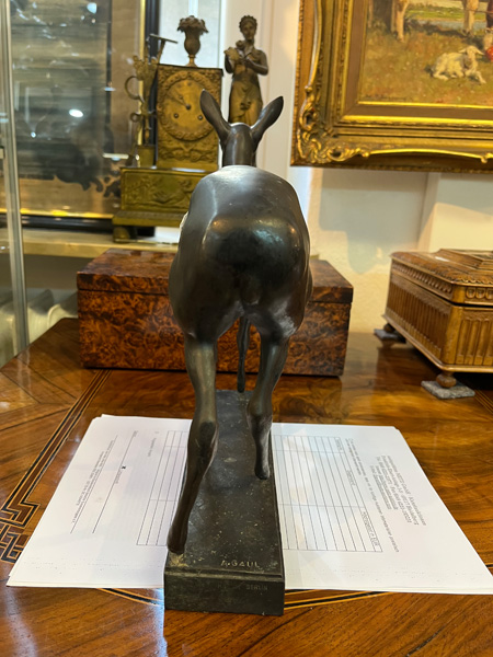 - Katalog-Nr: 84August Gaul (1869-1921). Schreitendes Reh. Bronze, auf der Plinthe sign., mit Gießerstempel „H.(ermann) Noack, Berlin“, H=31 cm. Die Plastik des „Stehenden Rehs“ und „Großen sichernden Rehs“ entstand als Vorarbeit zu einem unausgeführt gebliebenen Denkmal für den 1908 verstorbenen Maler Walter Leistikow. Durch die gemeinsame Arbeit in der Berliner Sezession und im künstlerischen Ansatz der Naturdarstellung mit Leistikow eng vertraut, wurde Gaul mit dem Denkmalsentwurf beauftragt. Die Planungen des Bildhauers sahen eine langgestreckte Bankanlage aus Stein vor, darin, auf einer mittig erhöhten Stele, das Porträtrelief Leistikows sowie zwei flankierende Rehe an beiden Enden der Anlage (WVZ Gabler 2007, 188–190). Aus diesem Werkkontext haben sich sowohl Güsse der beiden kleinformatigen Entwurfsmodelle aus dem Jahre 1913 (WVZ 189, 190) erhalten als auch die für die Denkmalsausführung entsprechend vergrößerten Fassungen (WVZ 253, 254). Im Gegensatz zu seinem Pendant löst das „Große sichernde Reh“ die streng symmetrische Anlage durch eine gezielte Wendung des Kopfes auf und antizipiert in seiner Gestaltung die räumliche Aufstellungssituation: Mit gespitzten Ohren und nach oben gerecktem Maul scheint es wachsam die sich nähernden Betrachter:innen zu wittern, gleichzeitig sind die spitzen Ohren, die filigran modellierten Beine sowie die kompakte silhouettenhafte Form des Körpers ganz auf eine Fernwirkung der Plastik ausgerichtet. Entgegen früheren Angaben sind keine Güsse zu Lebzeiten Gauls gesichert, jedoch war 1921 eine Auflage von fünf Güssen genehmigt worden.o.L.