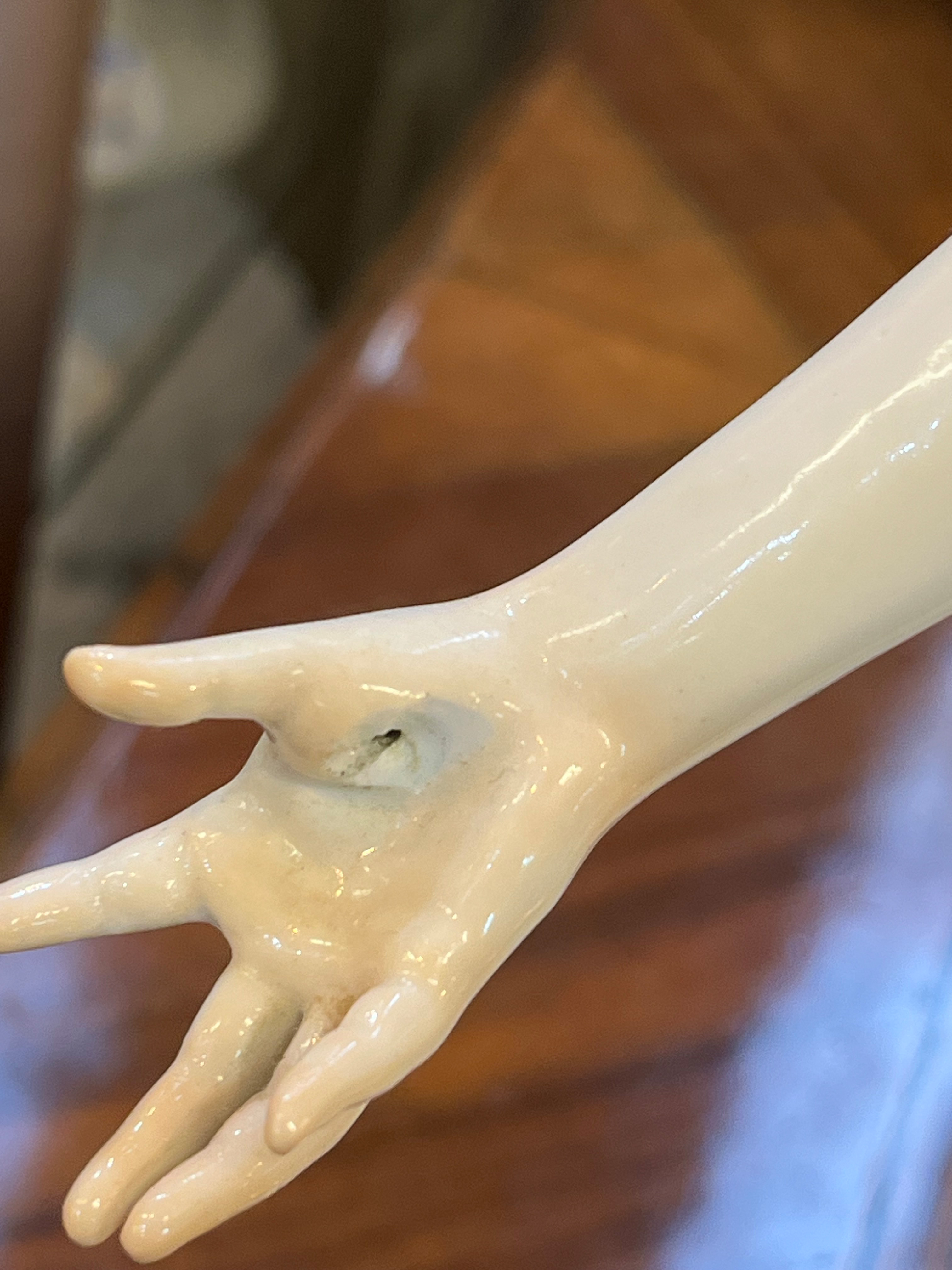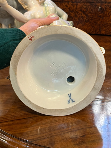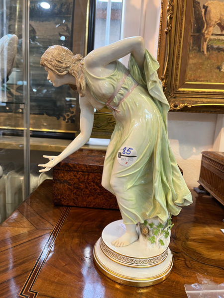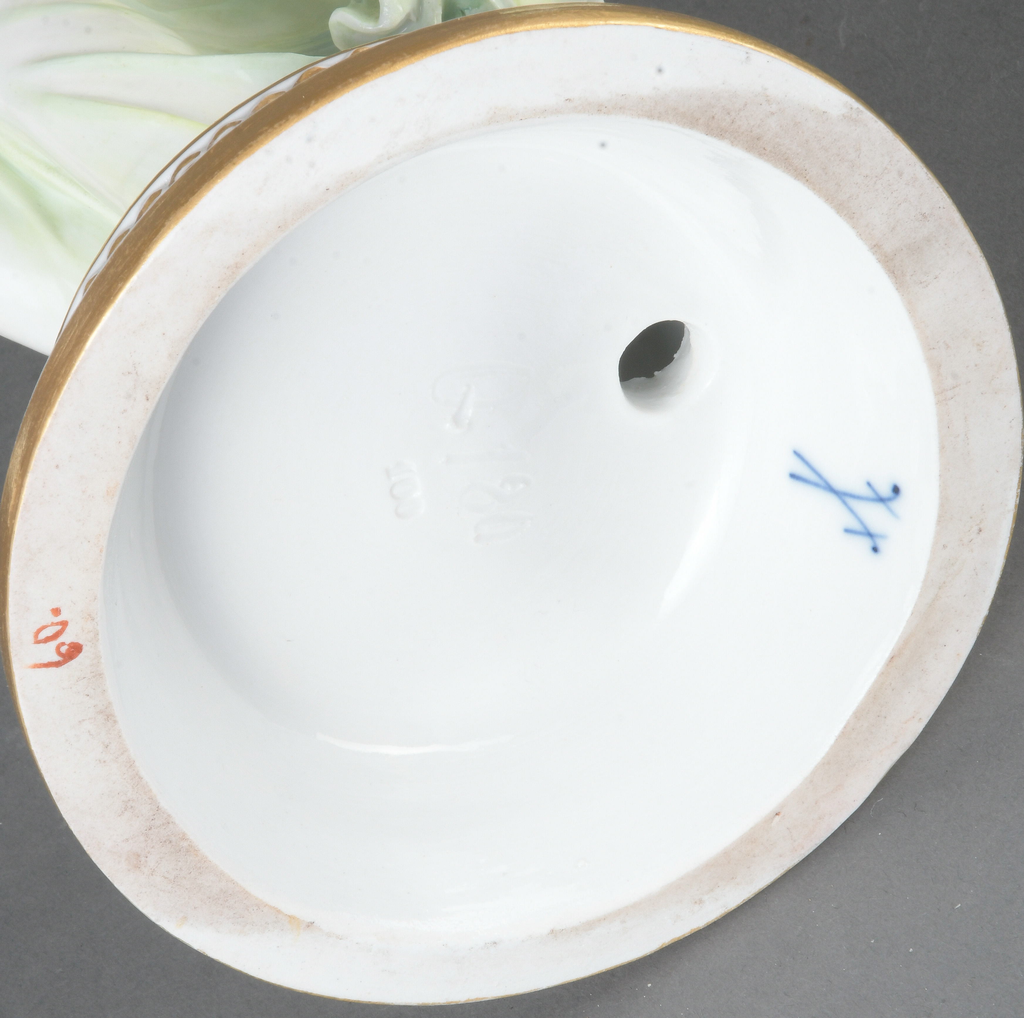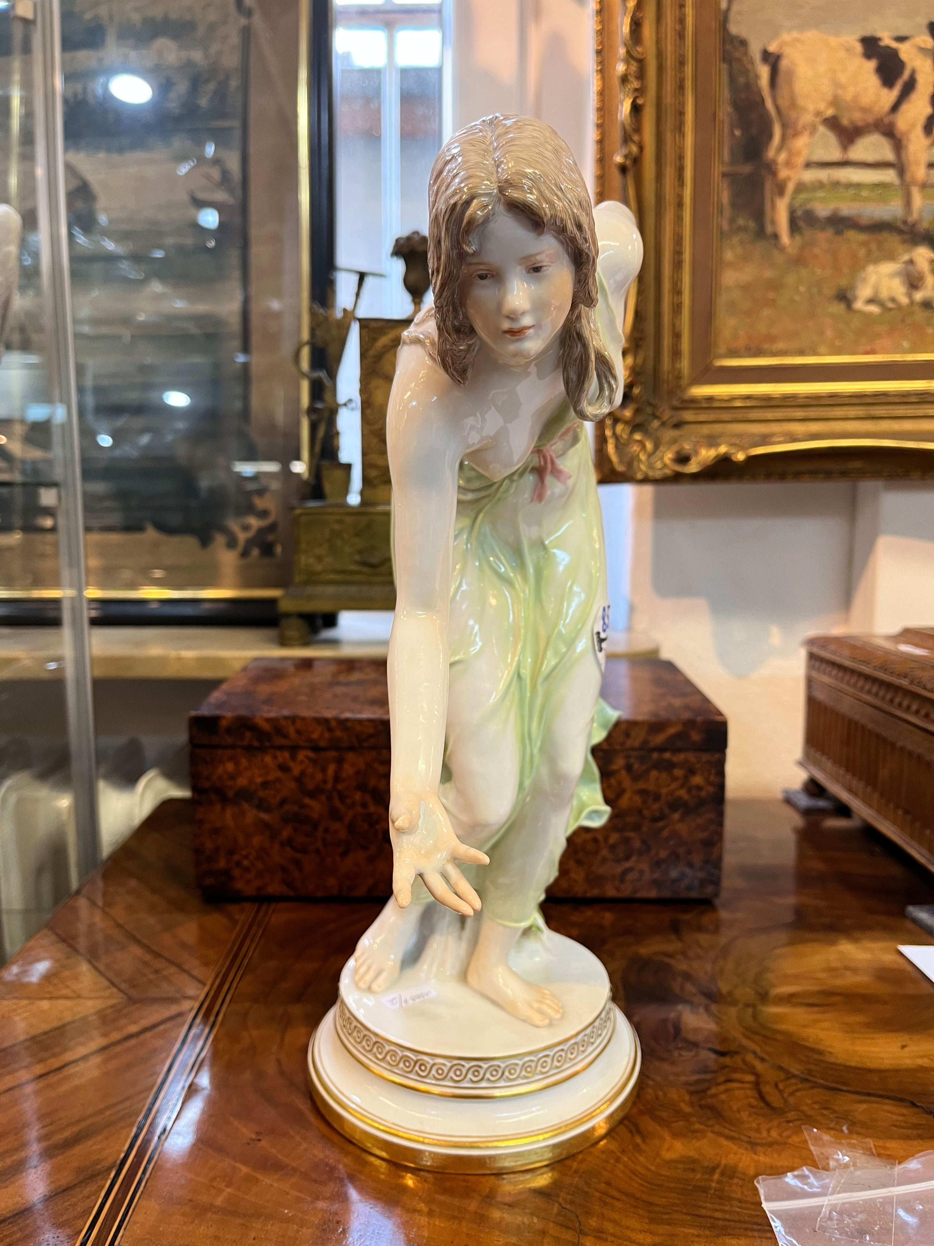 - Katalog-Nr: 85Kugelspielerin. Meissen 1897. Porzellan, bunt bemalt; am Boden unterglasurblaue Schwertermarke, Formnummer „Q180“, Staffiererziffer „60“, H=36 cm. (Blätter min. verso best.)o.L.