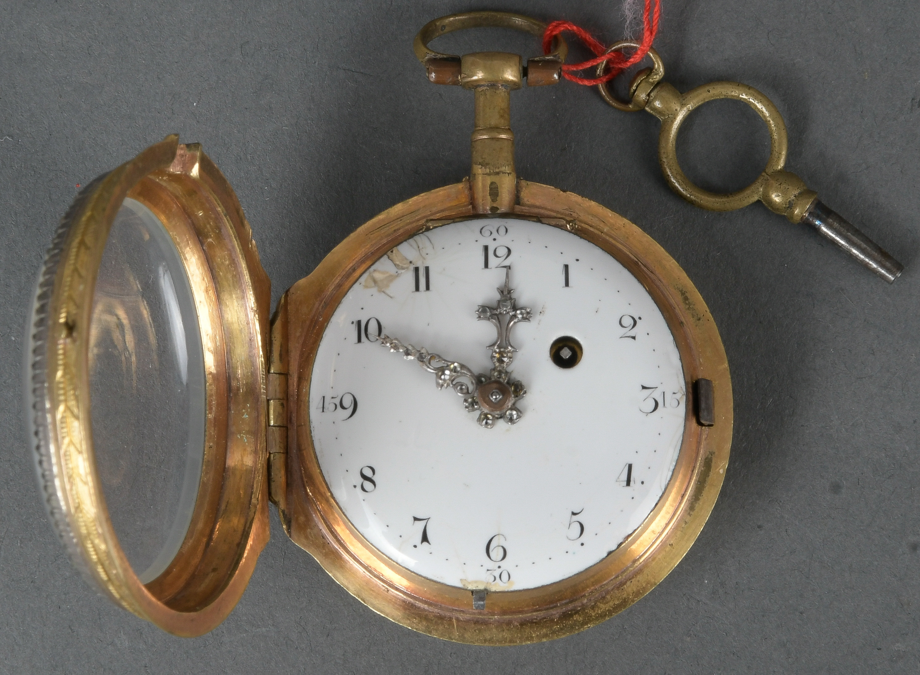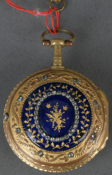 - Katalog-Nr: 88Taschenuhr in Schutzgehäuse. Genf, wohl Meister Philipp Terrot. Uhrengehäuse mit Gelbgold-Deckel, blau emailliert und besetzt mit Diamantrosen, Emailzifferblatt mit Schlüsselaufzug, Spindelwerk; vergoldetes Schutzgehäuse, beidseitig emailliert, D=4,4 / 4,9 cm. (Schutzgehäuse teilw. mit Abplatzungen / Funktion ungeprüft)o.L.