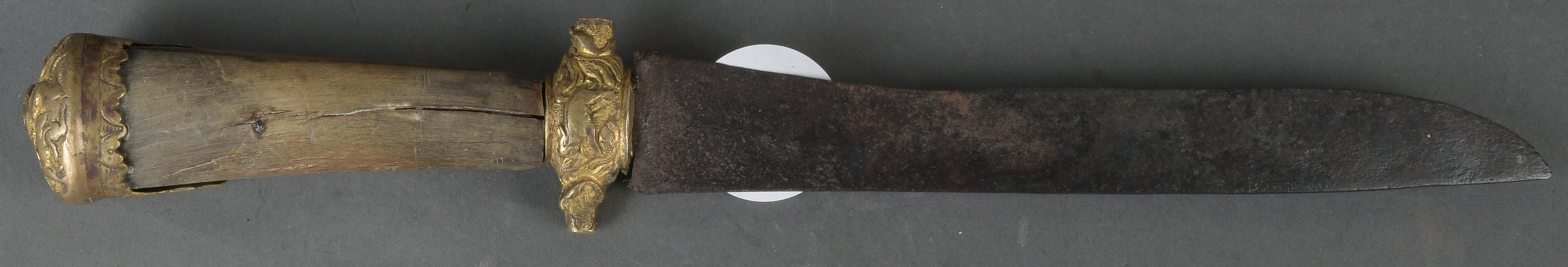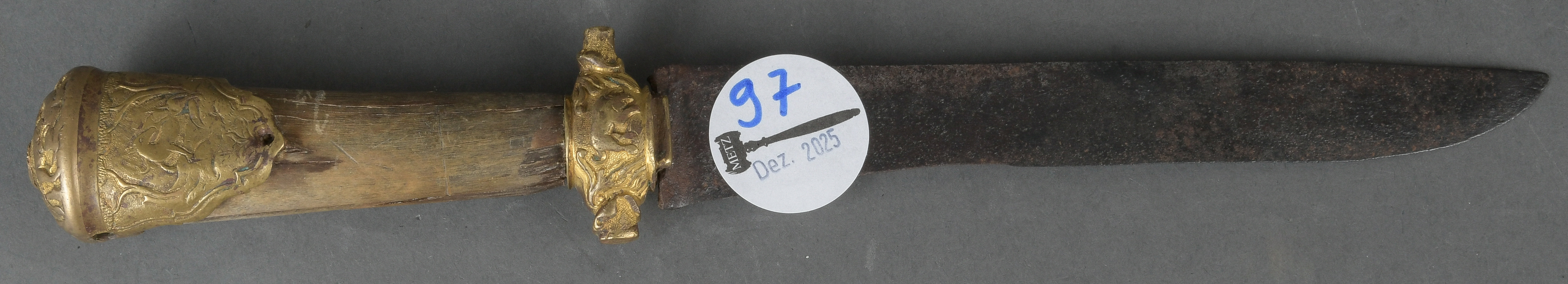 - Katalog-Nr: 97Jagddolch. Deutsch 18. Jh. Holzgriff mit Bronzeapplikationen und Stahlklinge, L=30 cm. (Scheide fehlt)o.L.