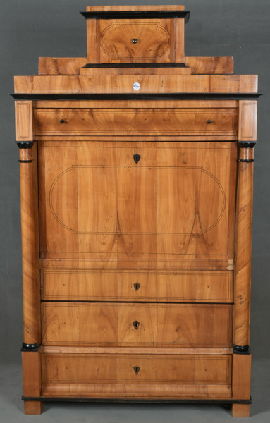 - Katalog-Nr: 92Biedermeier-Standsekretär. Süddeutschland 1815-20. Kirschbaum furniert und teilw. ebonisiert, mit Fadeneinlagen; Klotzfüße, profilierter Sockel, fünfschübig, Schreibklappe mit Inneneinteilung und Geheimfach, profiliertes, getrepptes Abschlussgesims, H=184 cm, B=110 cm, T=53 cm.o.L.