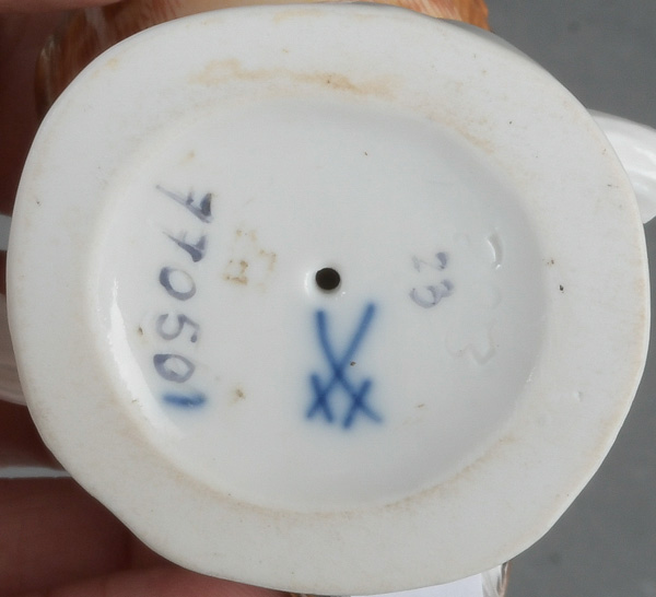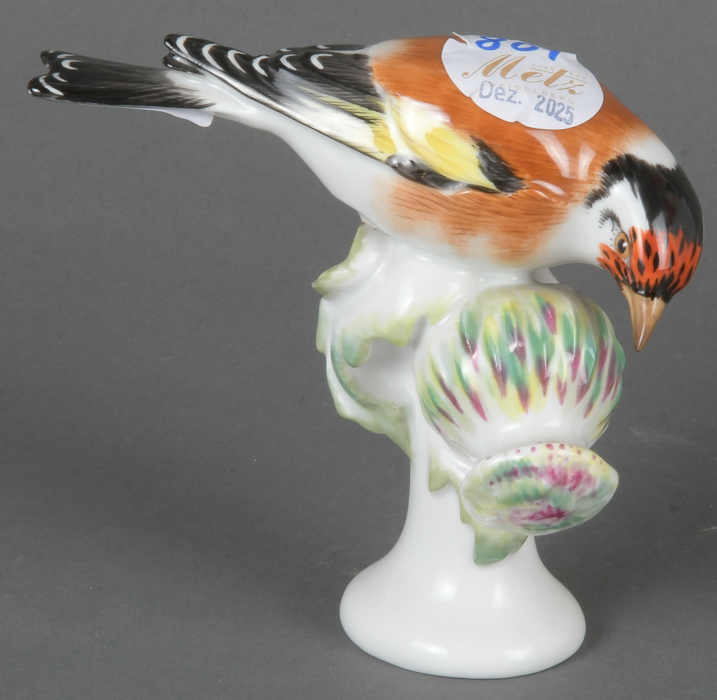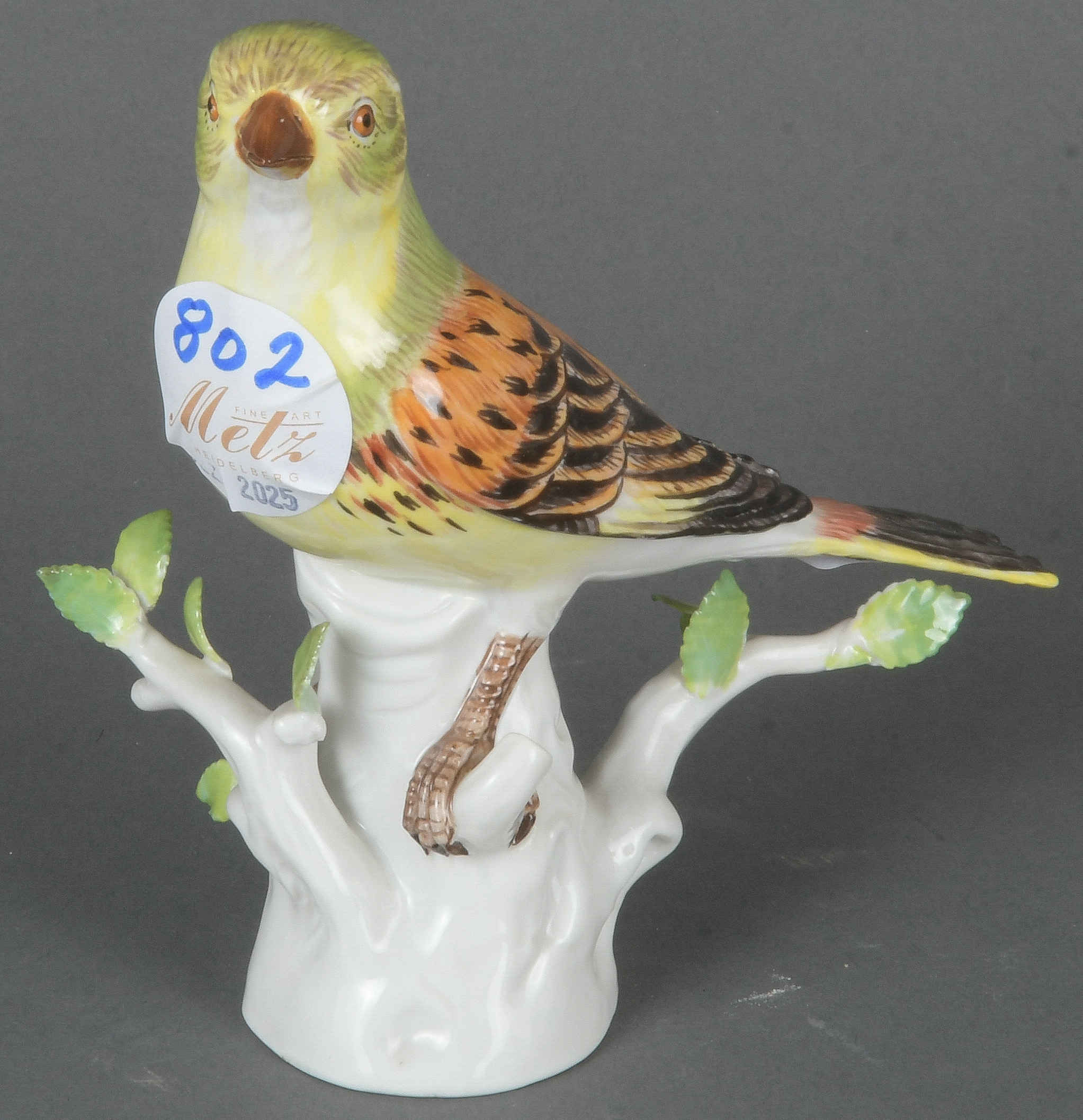 - Katalog-Nr: 802Goldammer. Meissen 20. Jh. Porzellan, naturalistisch modelliert und staffiert; am Boden unterglasurblaue Schwertermarke, Modell nach Johann Joachim Kaendler, H=13 cm.o.L.