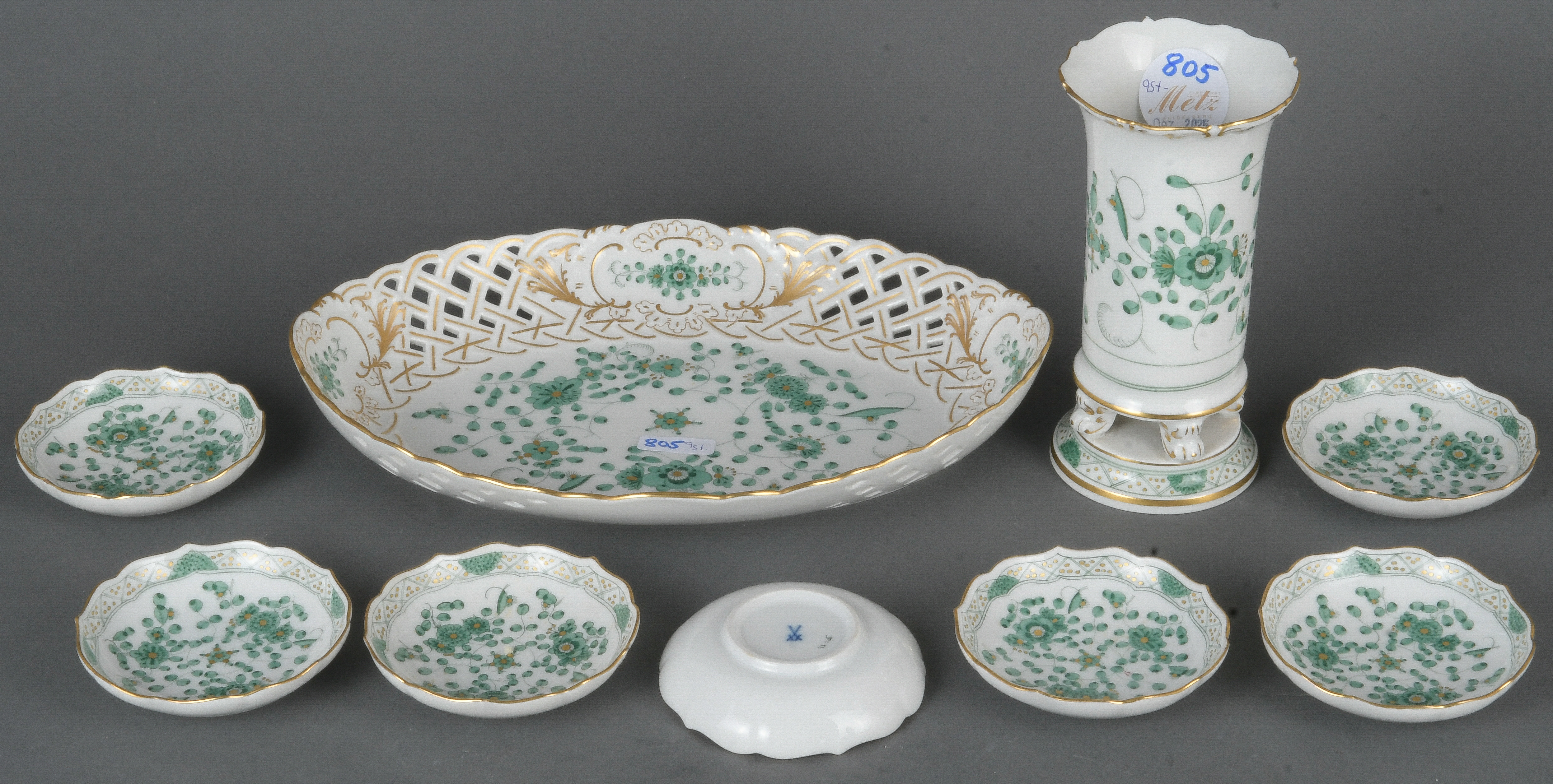 - Katalog-Nr: 805Neun Formteile „Indianische grüne Blume“. Meissen 20. Jh. Porzellan, am Boden unterglasurblaue Schwertermarke. Bestehend aus: Sieben runde Schälchen (D=je 8,1 cm), ein ovaler Durchbruchskorb (H=4,5 cm, B=25 cm, T=18 cm) und eine walzenförmige Vase (H=14,5 cm)o.L.