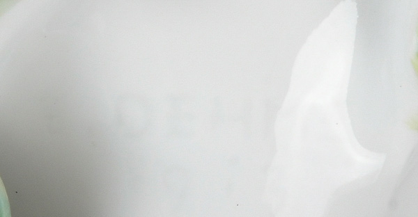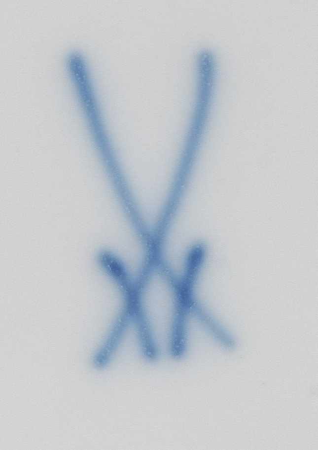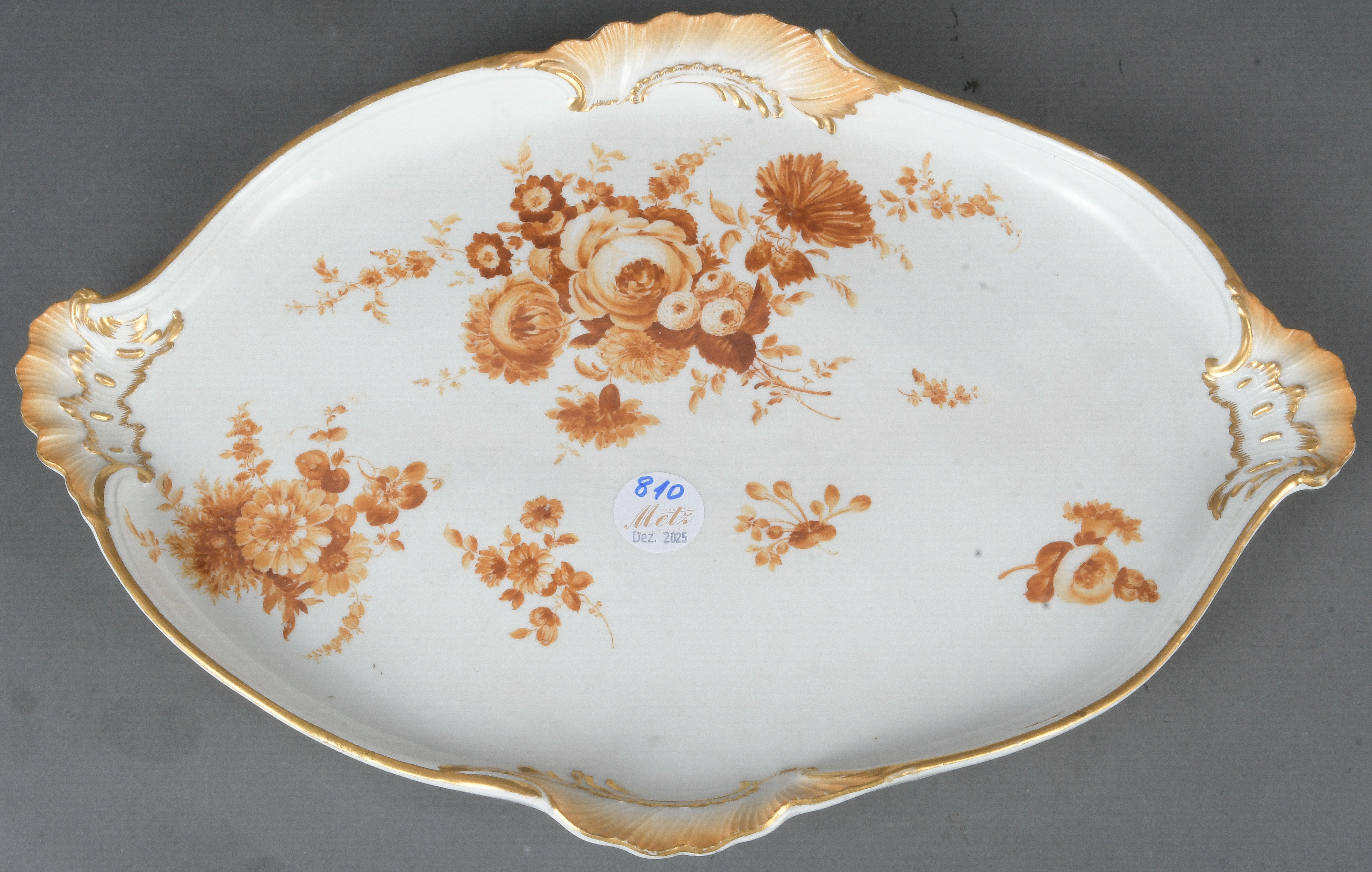 - Katalog-Nr: 810Große, ovale Platte. Meissen 1763-73. Porzellan, mit rocaillereliefiertem, gold gesäumtem Lippenrand und brauncamaieu gemaltem Floraldekor; verso unterglasurblaue Schwertermarke, H=3,5 cm, B=44 cm, T=31,5 cm.o.L.
