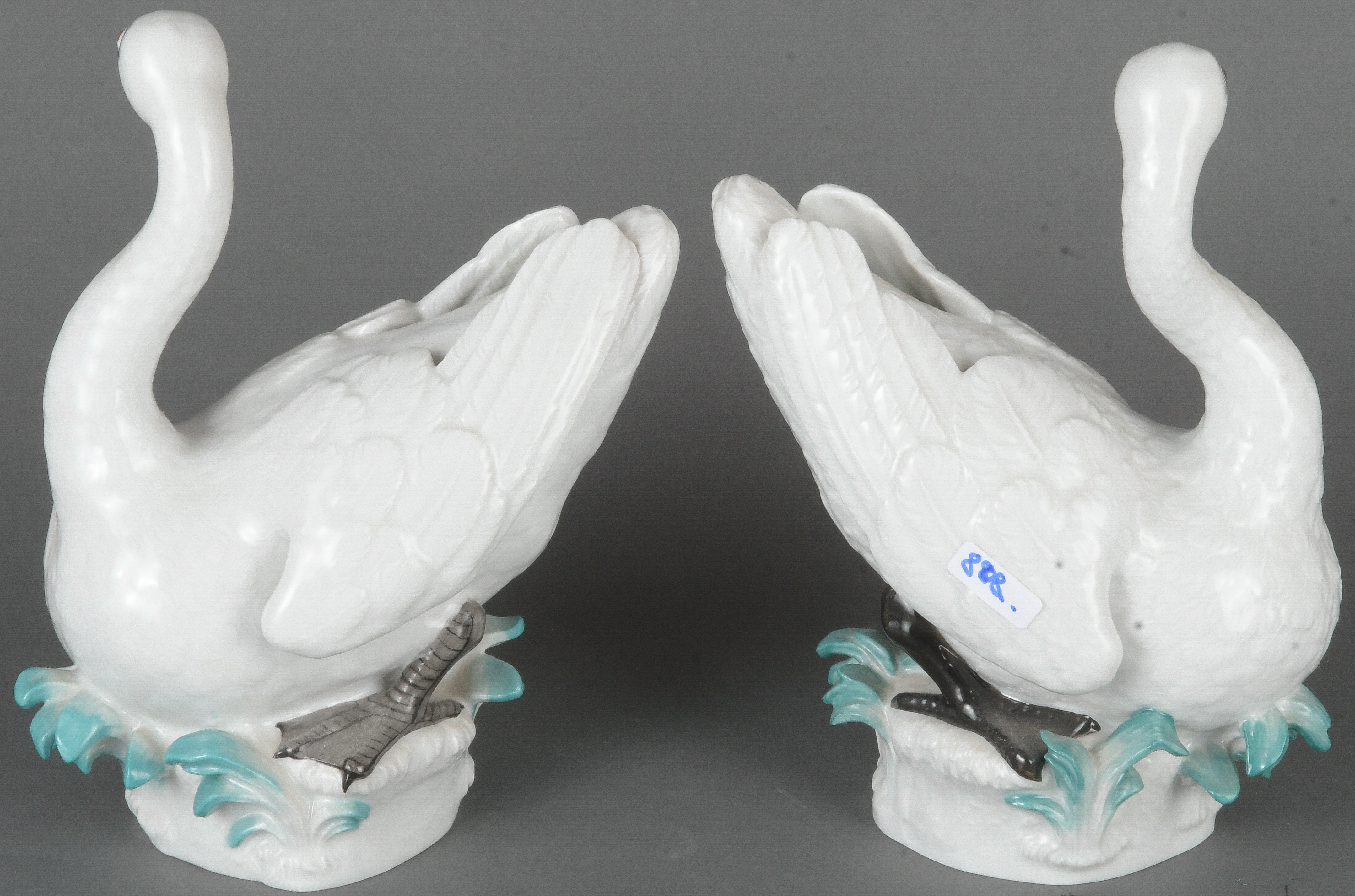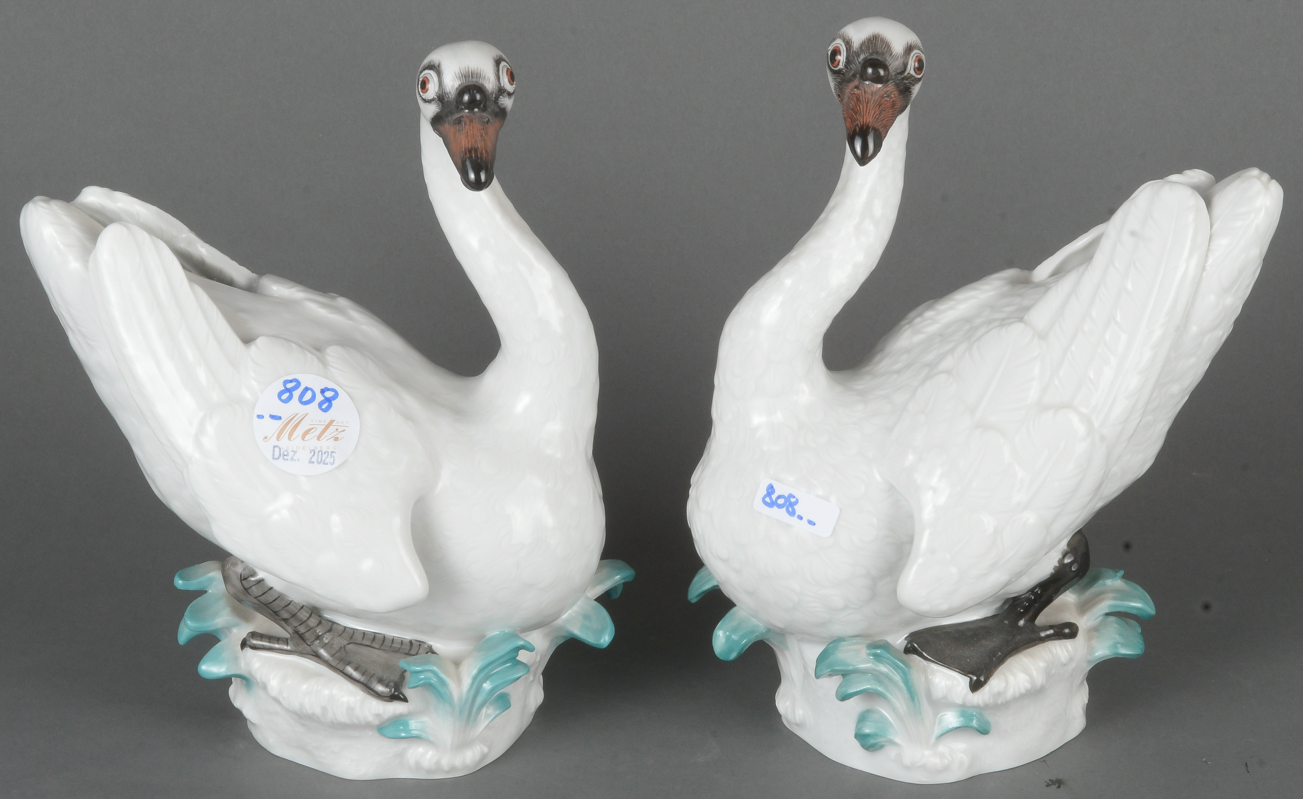 - Katalog-Nr: 808Schwanenpaar. Meissen 20. Jh. Porzellan, naturalistisch modelliert und staffiert; am Boden unterglasurblaue Schwertermarke. Modell nach Johann Joachim Kaendler, H=22 / 23,5 cm.o.L.